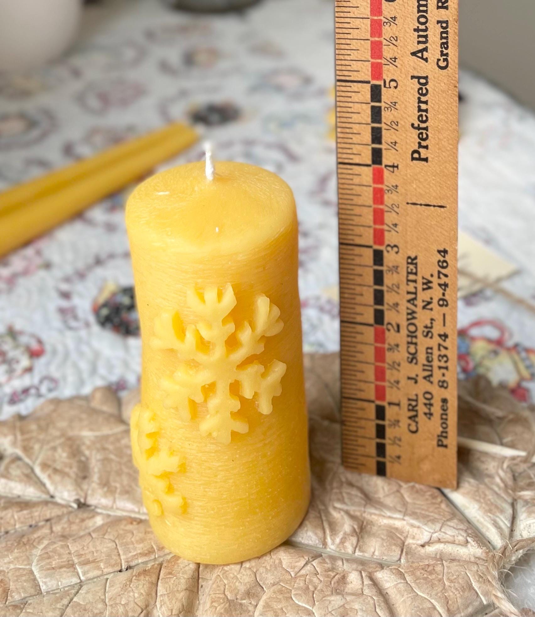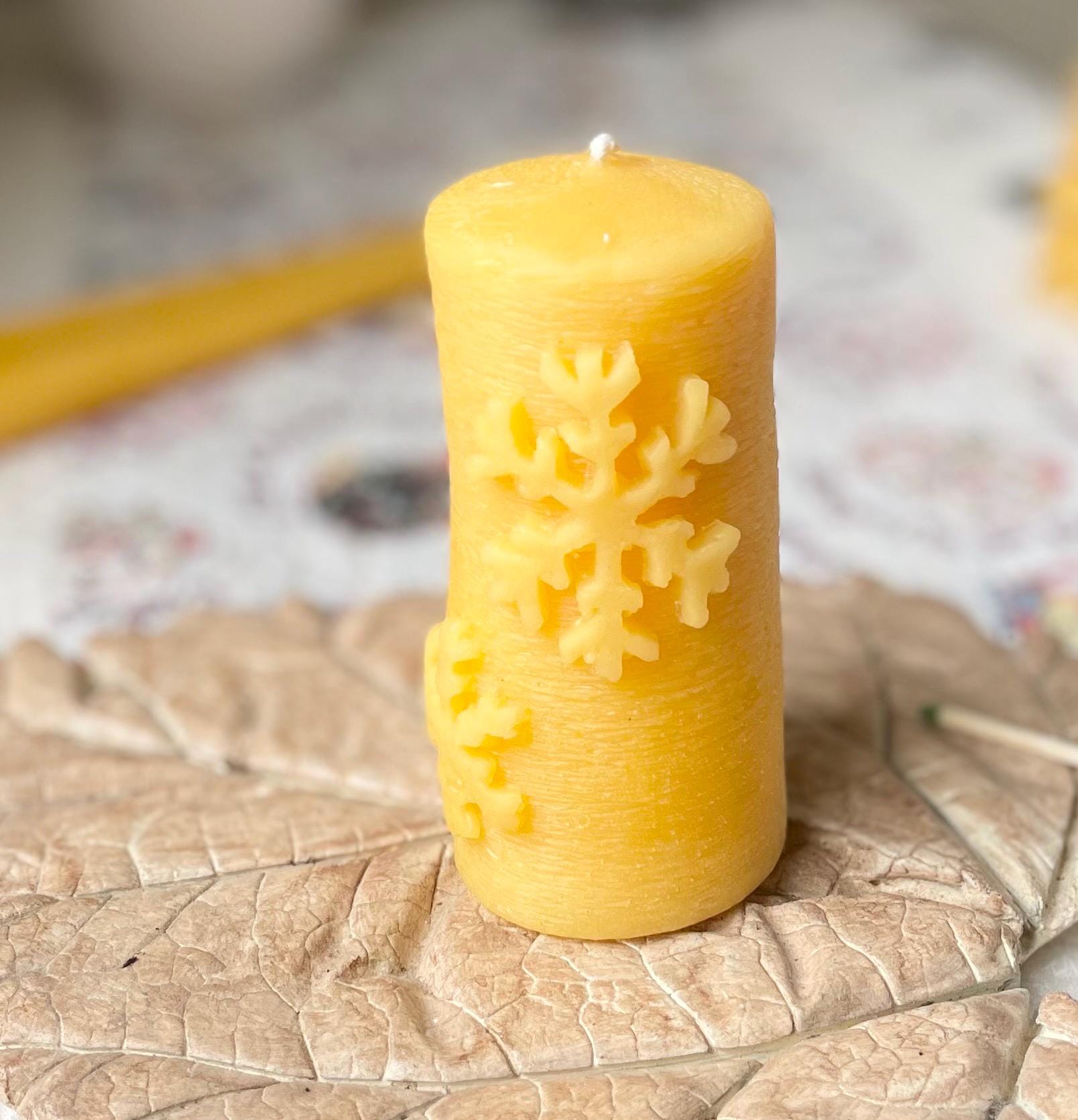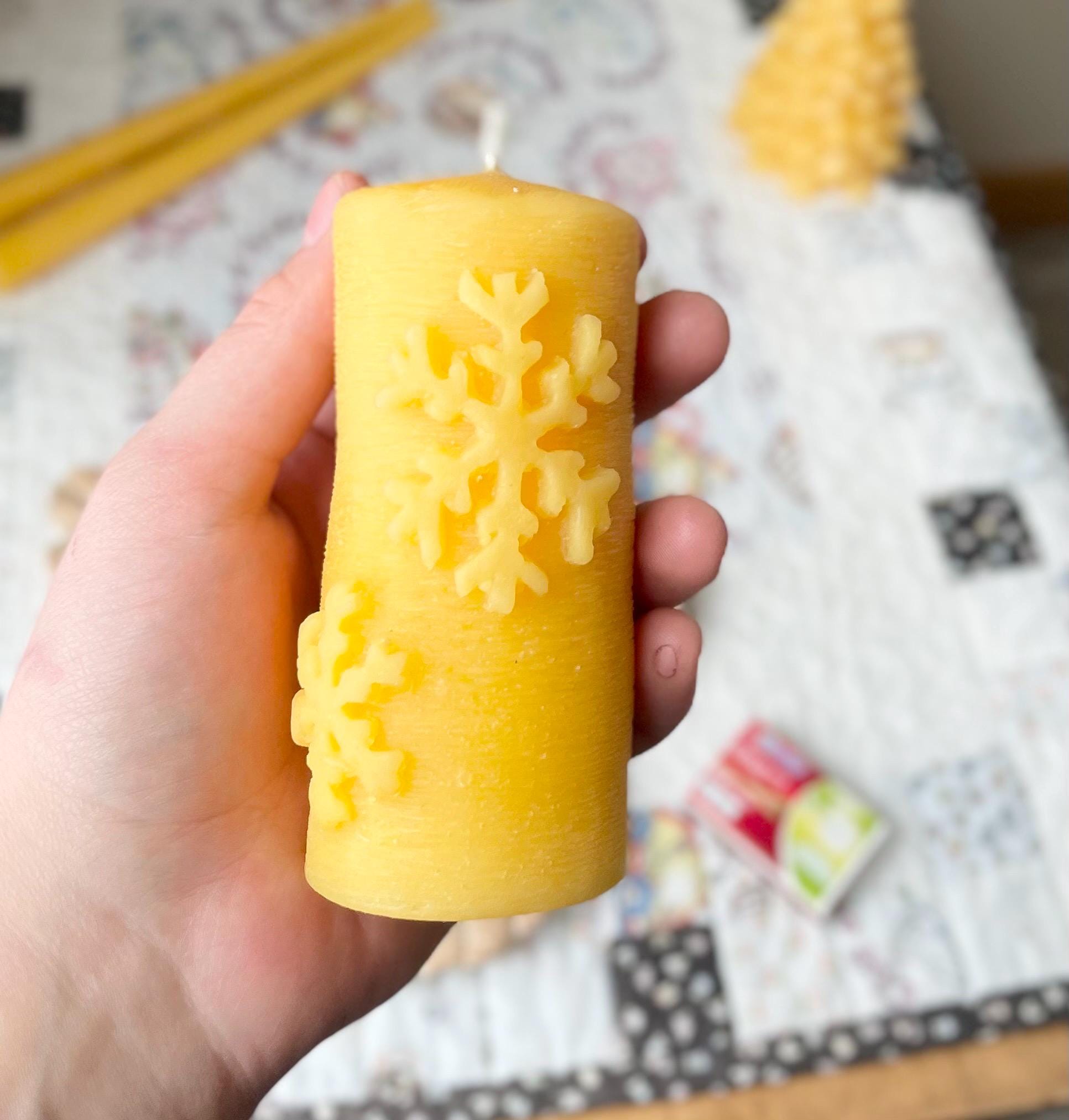 Natural beeswax candle, sourced from bees on our family fruit farm! We melt the wax, then pour into this mold, let it cool and it’s ready! This pillar candle features a delicate snowflake on the front, plain in back. Almost too pretty to burn, but when you do the mild honey scented wax is sure to fill the room with a subtle, friendly aroma.