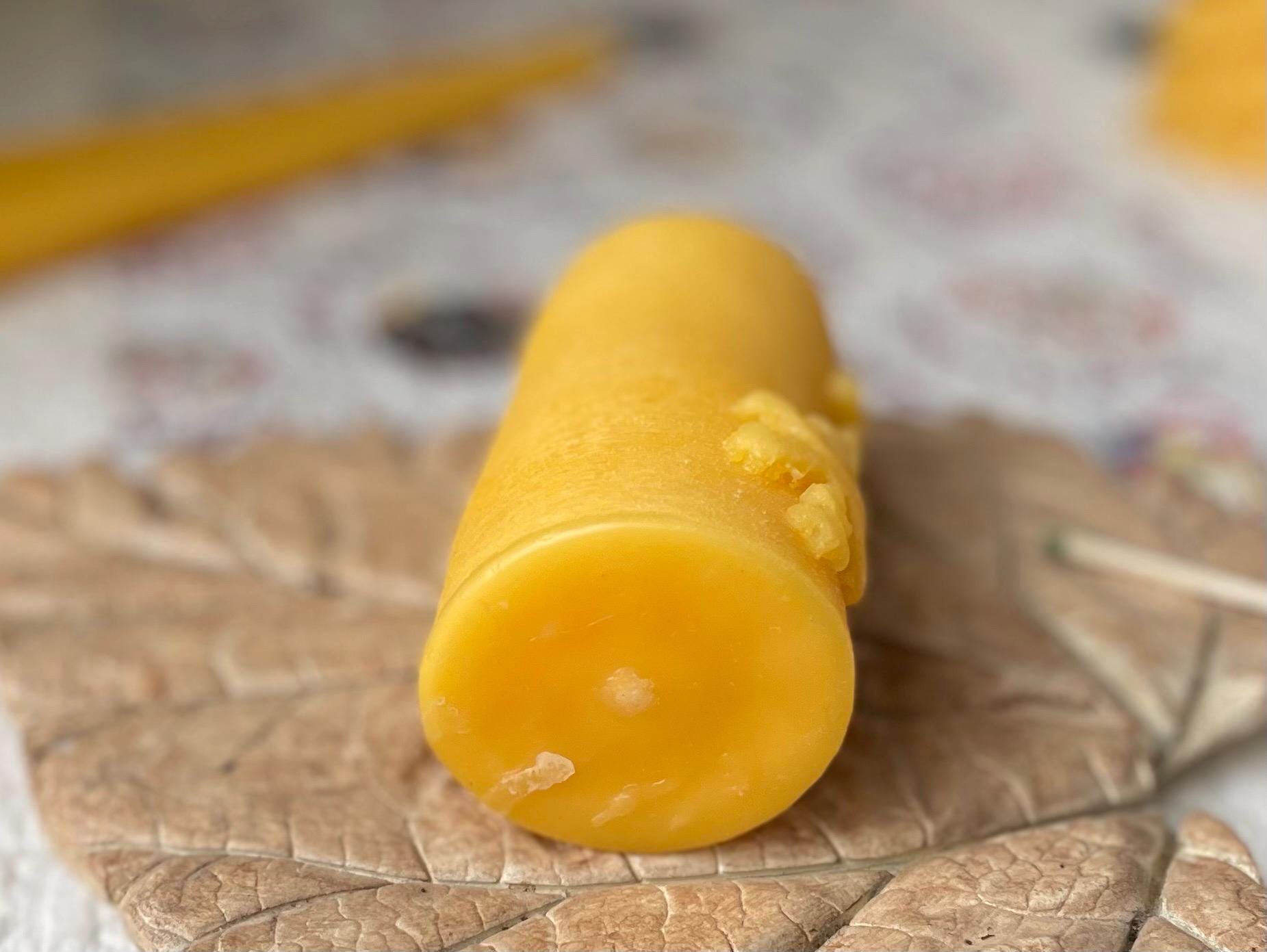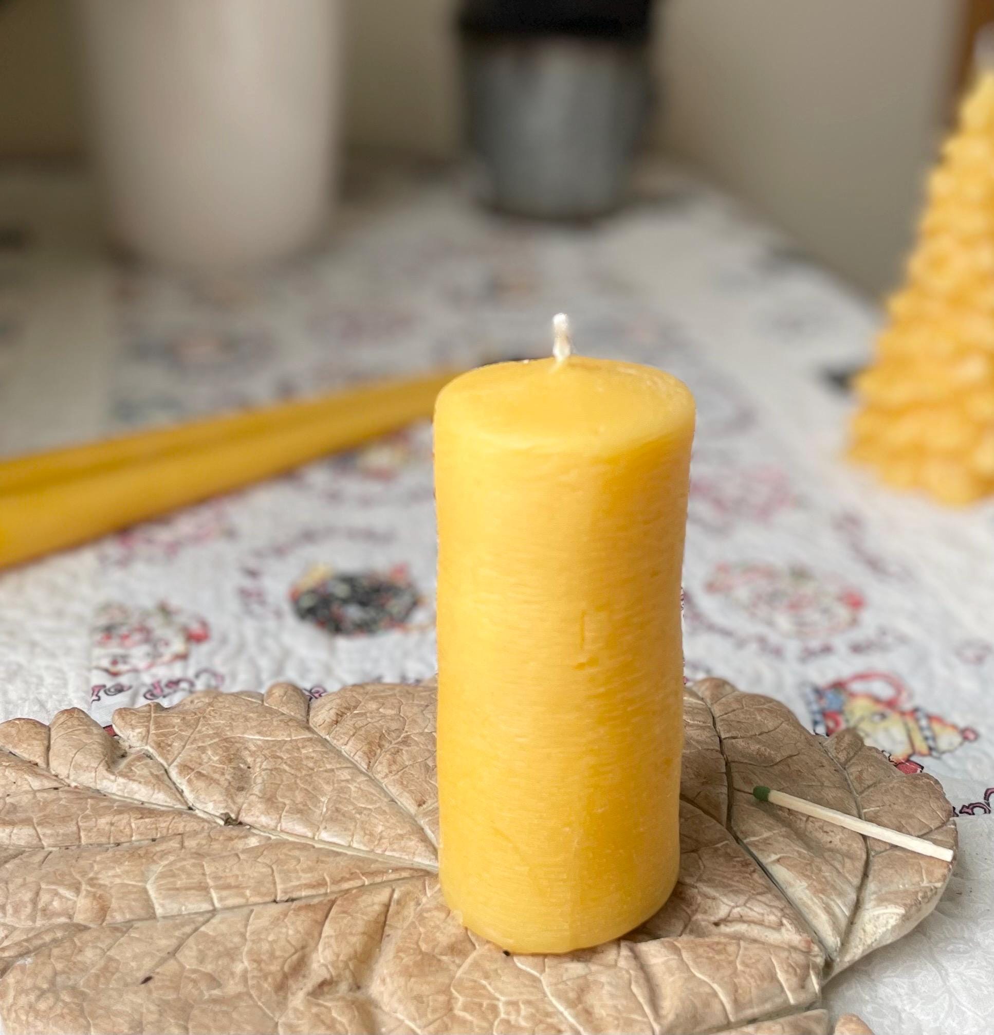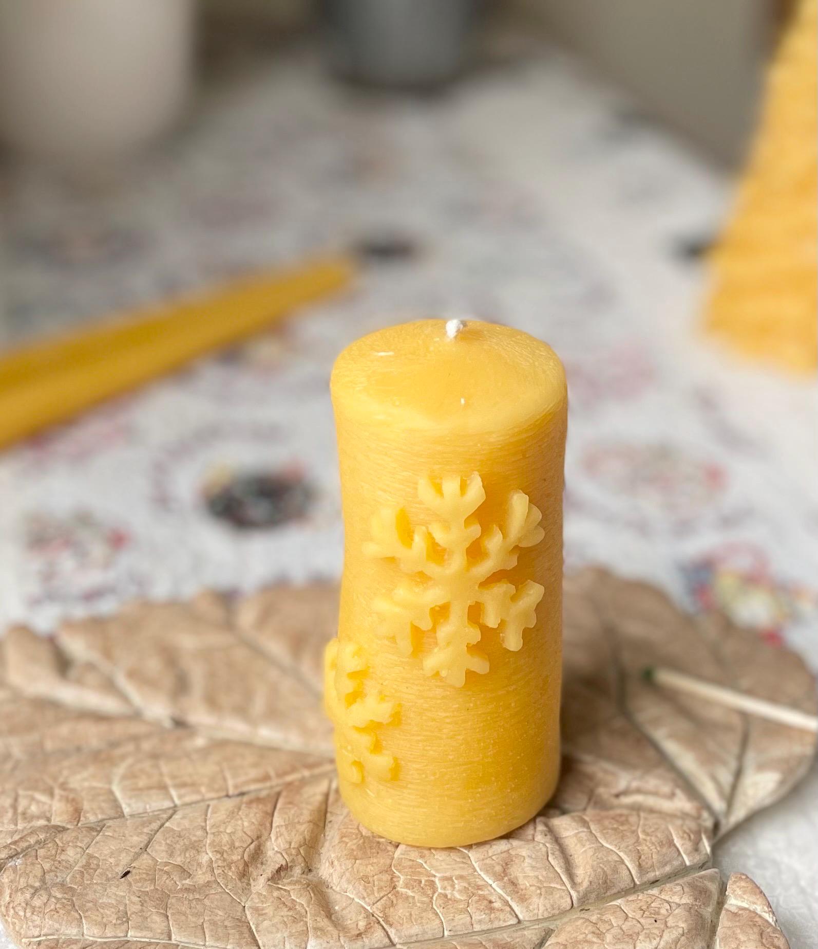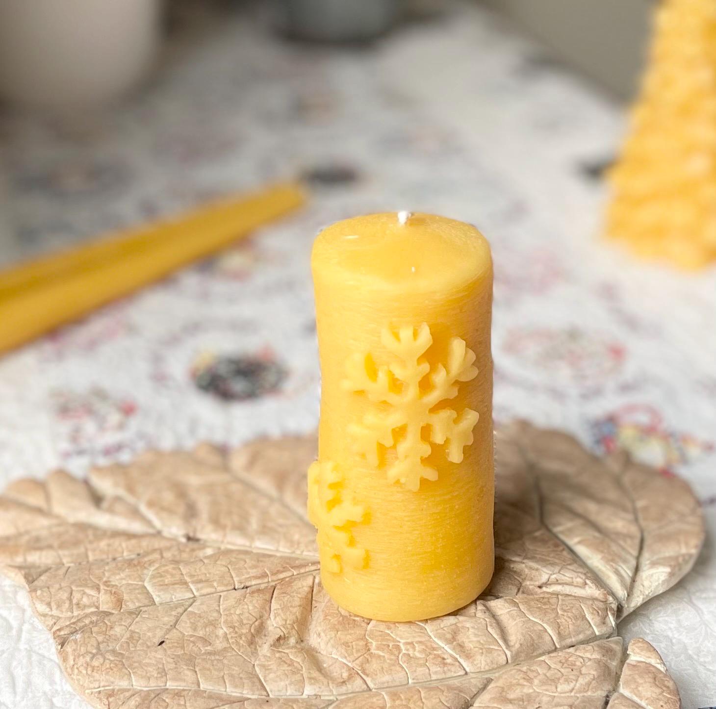 Natural beeswax candle, sourced from bees on our family fruit farm! We melt the wax, then pour into this mold, let it cool and it’s ready! This pillar candle features a delicate snowflake on the front, plain in back. Almost too pretty to burn, but when you do the mild honey scented wax is sure to fill the room with a subtle, friendly aroma.