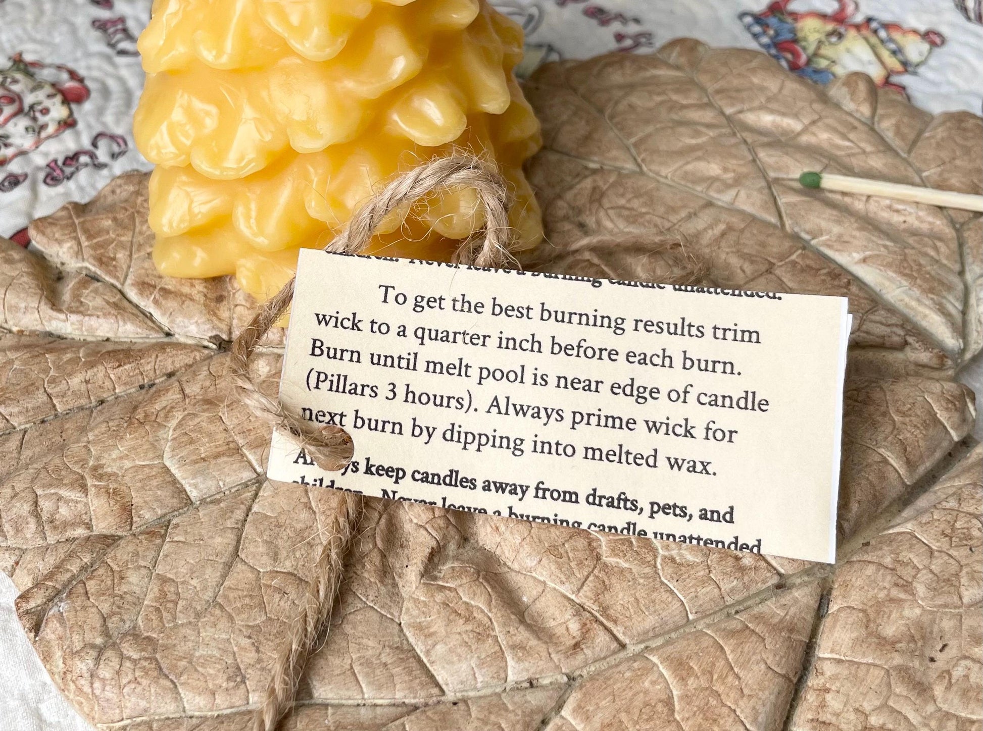 Please never leave candles burning unattended!!! Keep away from drafts, pets, and children. This pillar candle measures 4” high, though there can be some slight variation. Burn time is approximately 3 hours.