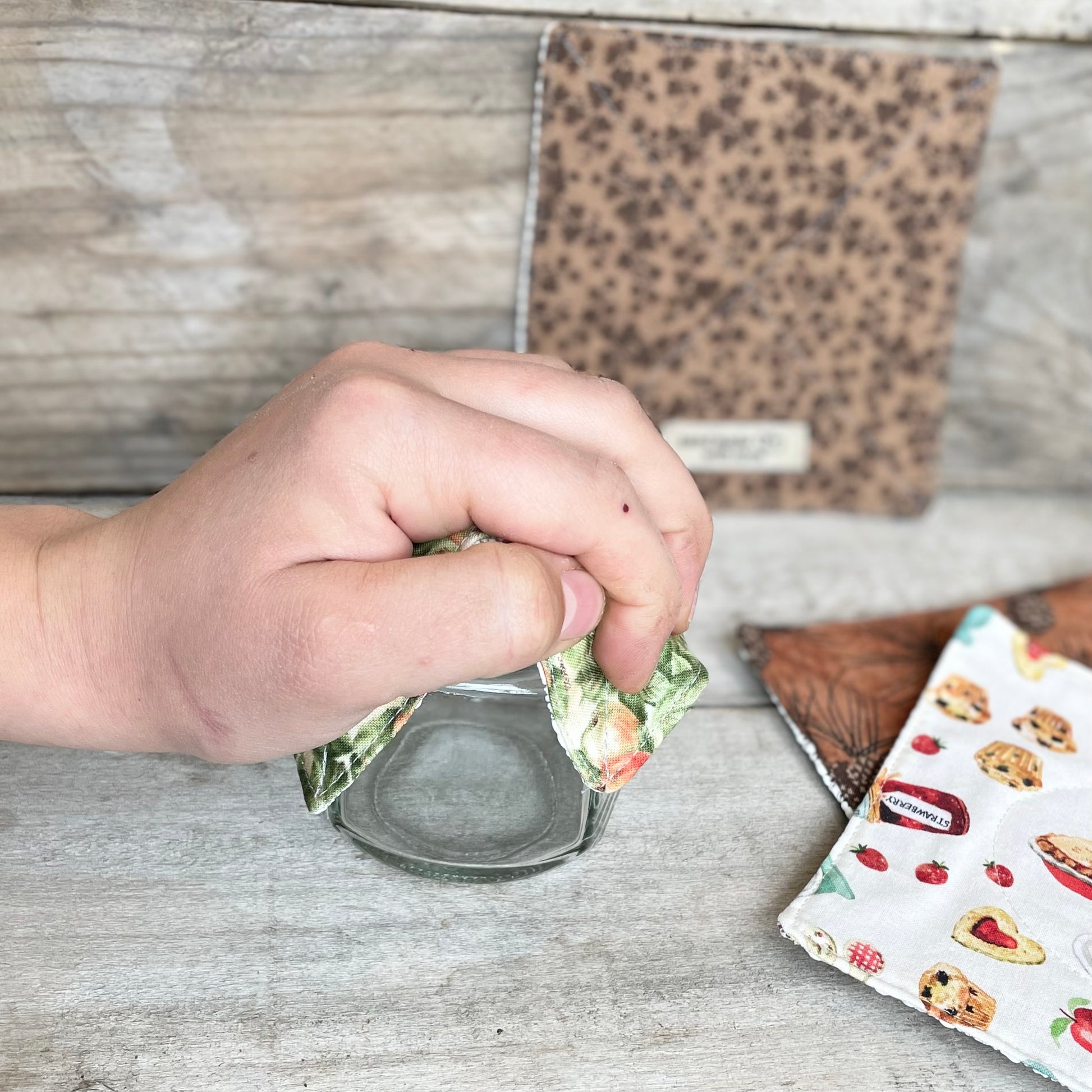 Need a little help getting that stubborn jar lid undone? This jar gripper is perfect for giving a little extra traction, especially useful for those struggling with arthritis, carpal tunnel, or similar joint and wrist pain. Your choice of fabric pattern, with textured gripping fabric on the back.