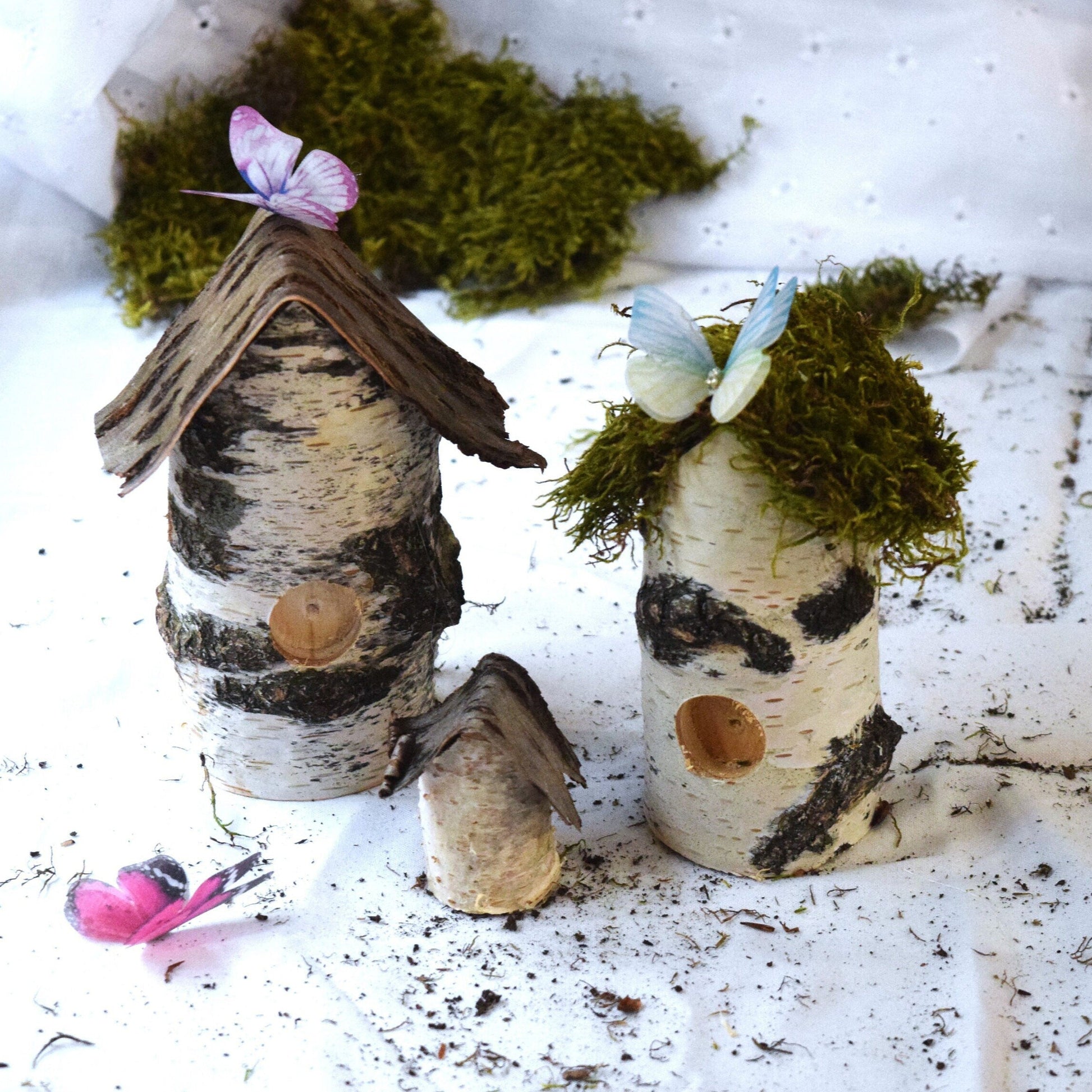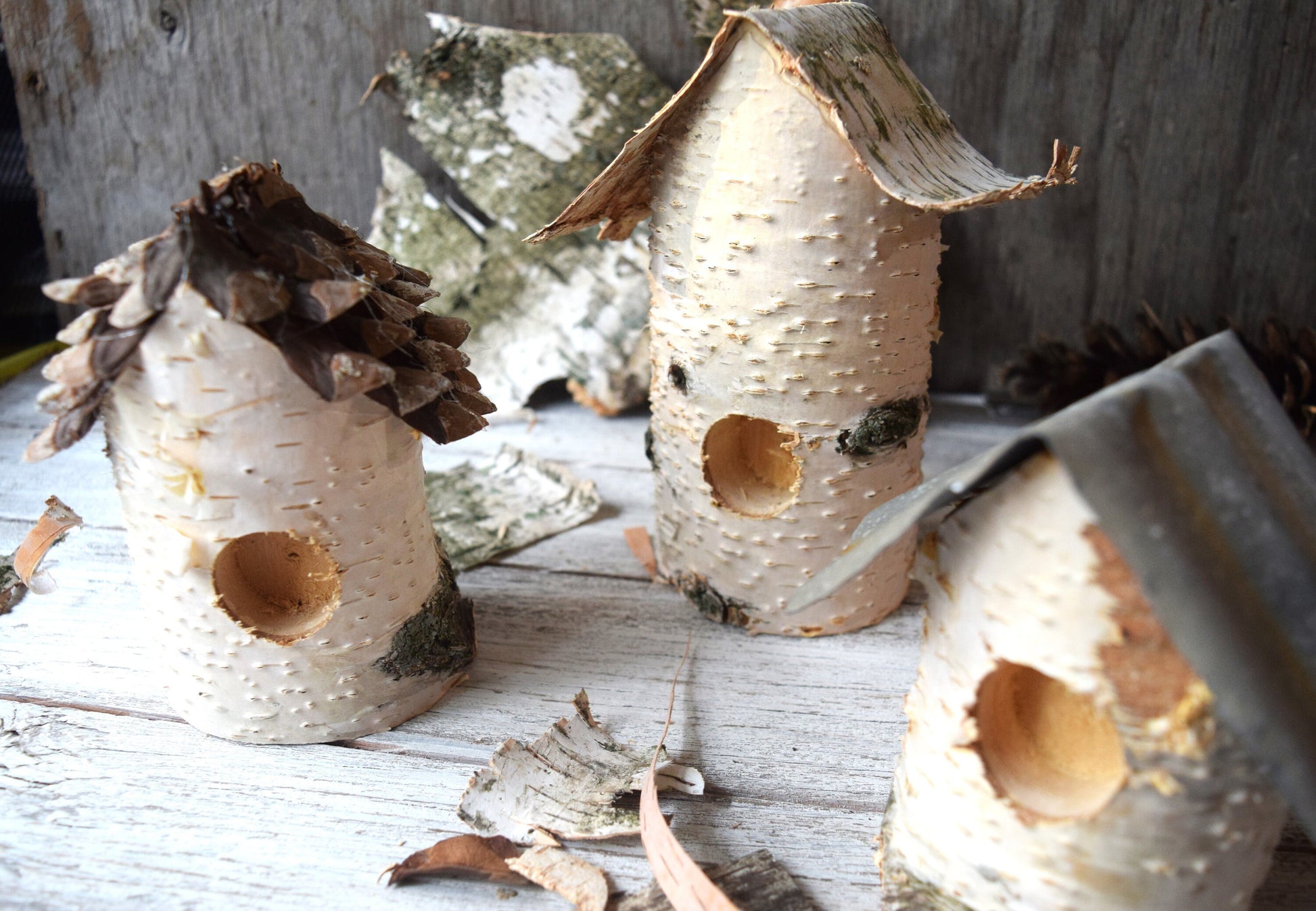 Birdhouses are made with different roof options: Moss roof, corrugated metal roof, birch bark roof, and cherry bark roof(brown bark). All materials are gathered on my home farm! Feel free to request mixing and matching to make a set.
