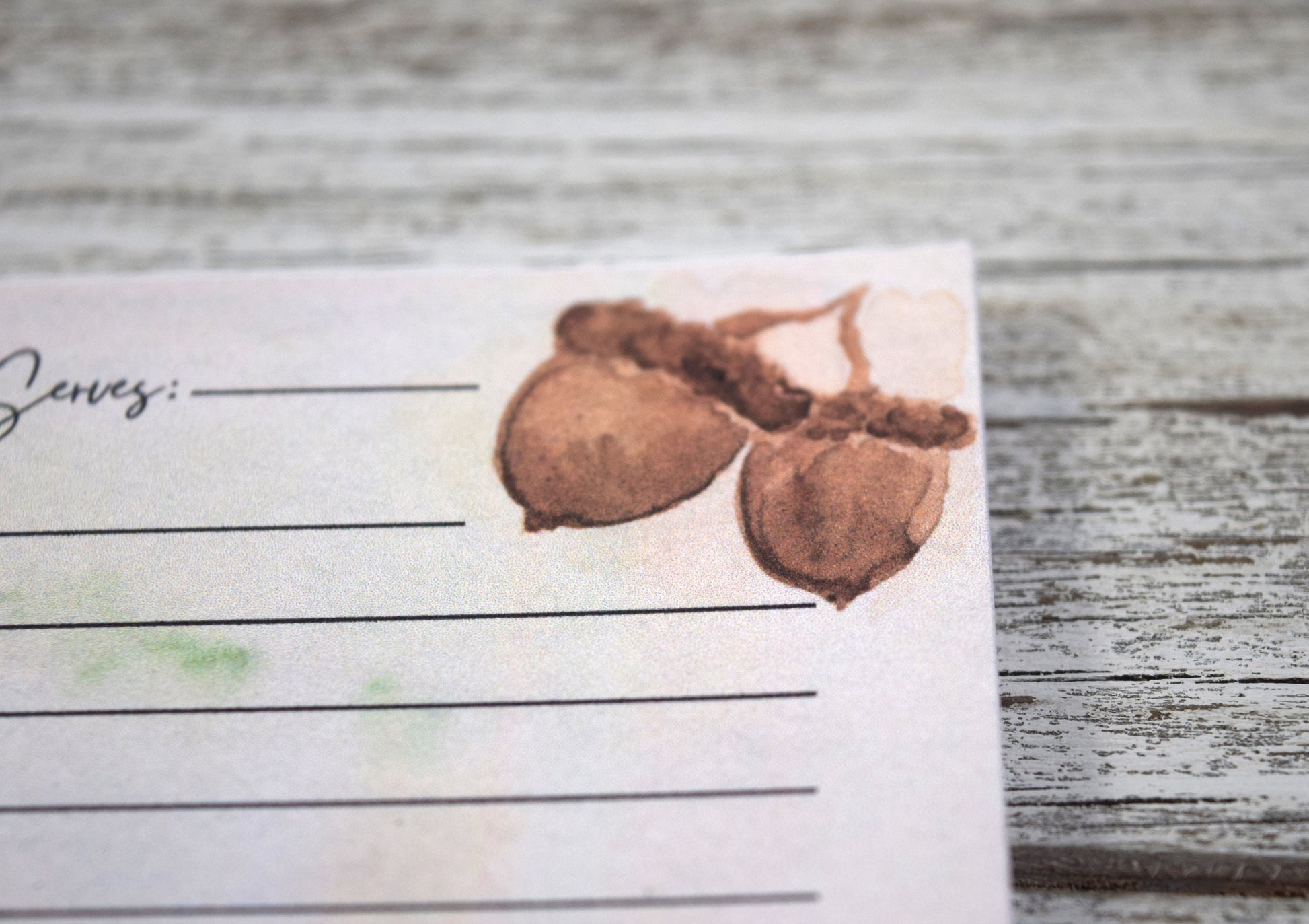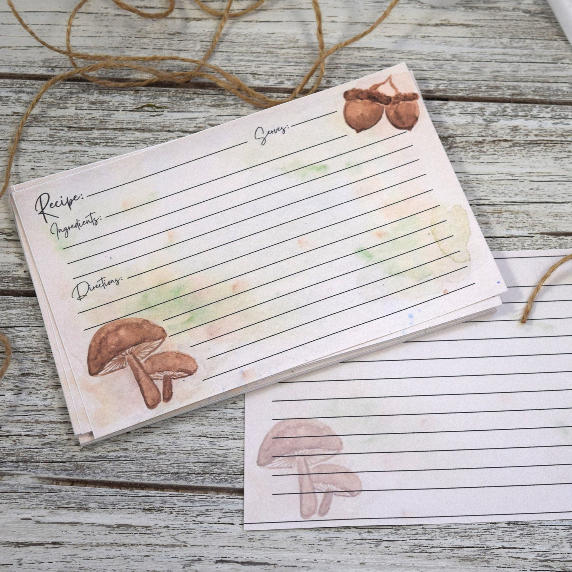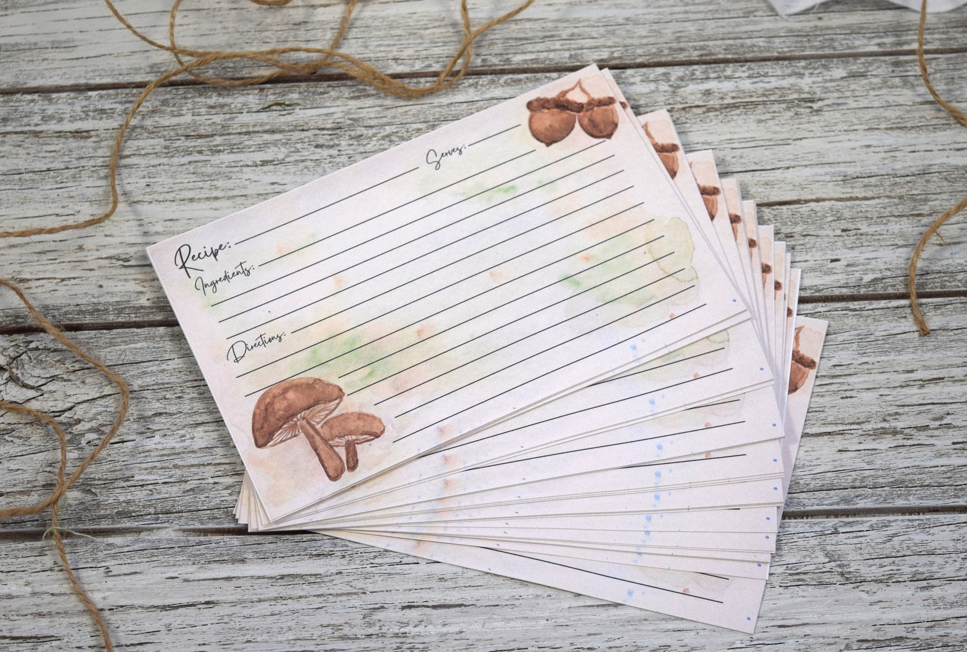 No printer? No problem! We print these recipe cards for you, saving you the time and headache of home printing. Choose pack size of 20 or 40 matching cards, with a watercolor painting of mushrooms and acorns on a green/brown background. It is a long process from designing and painting the artwork, to scanning and designing digitally, but they are ready for printing! These cards would add the perfect finishing touch to your new recipe box!