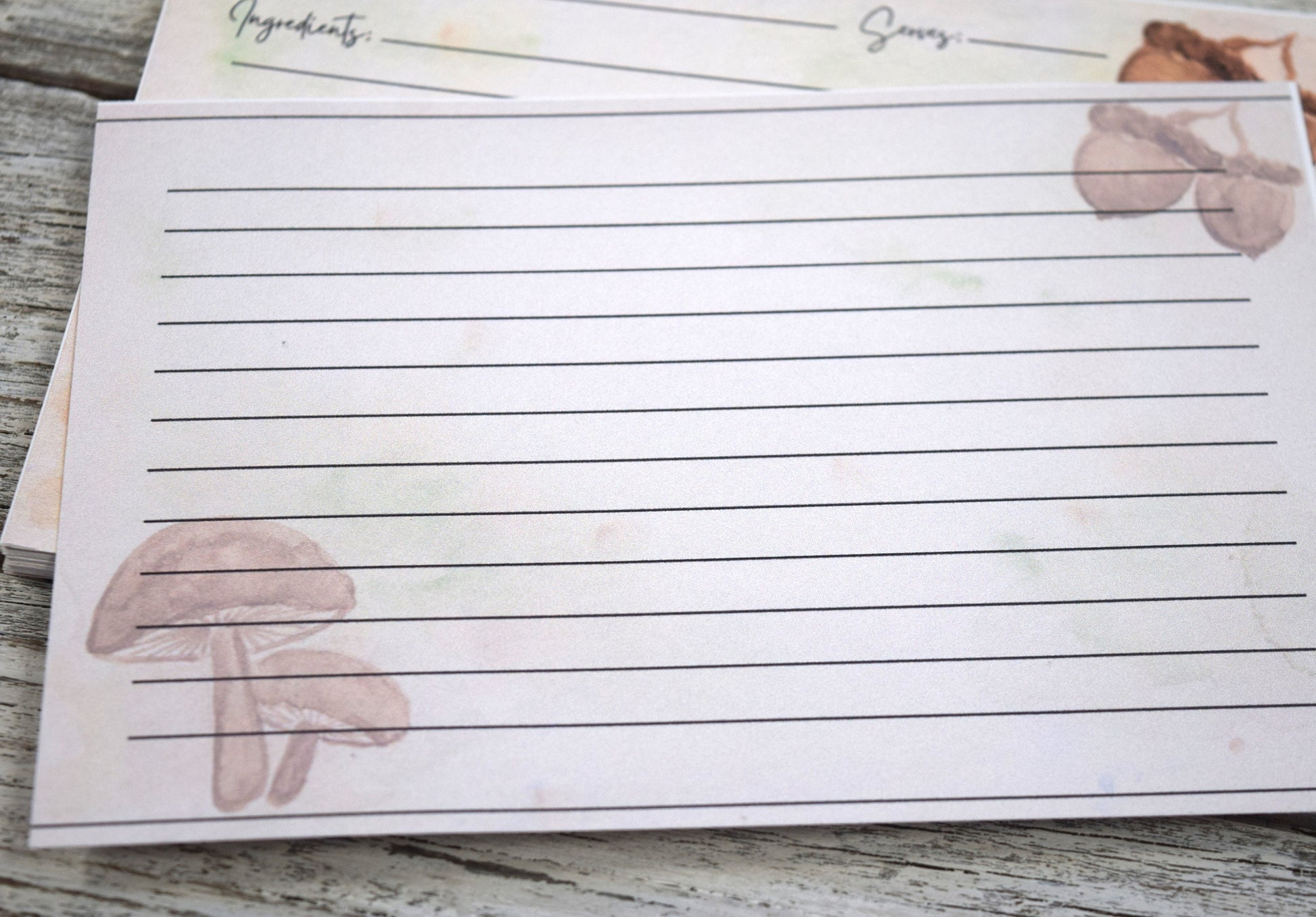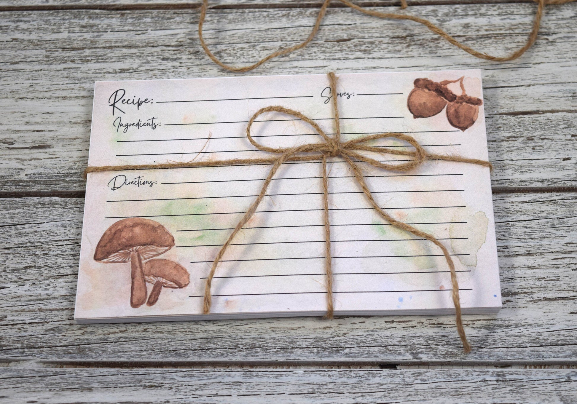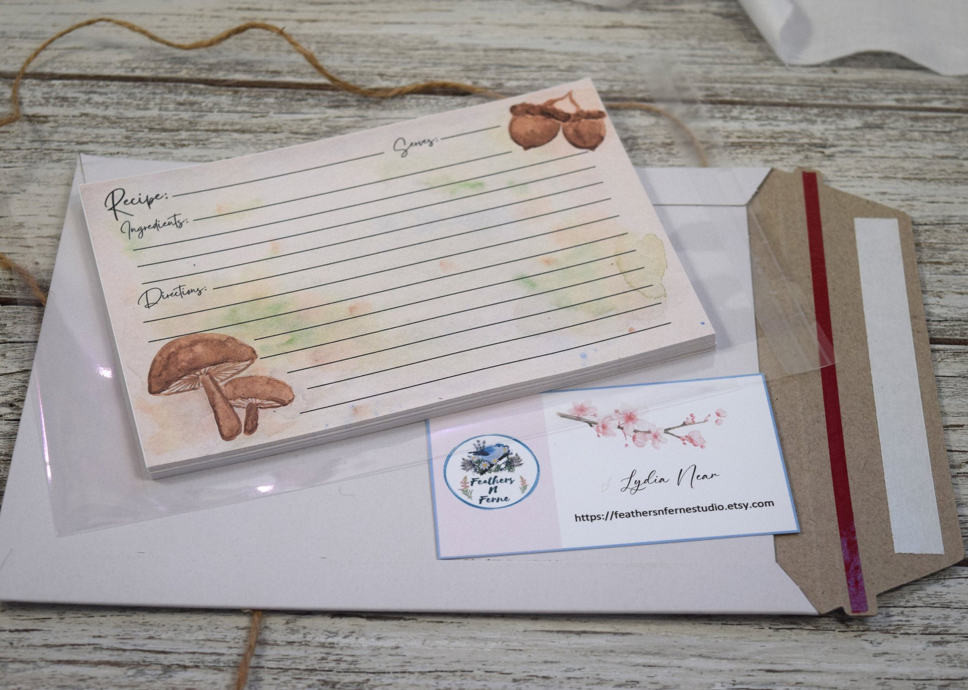 No printer? No problem! We print these recipe cards for you, saving you the time and headache of home printing. Choose pack size of 20 or 40 matching cards, with a watercolor painting of mushrooms and acorns on a green/brown background. It is a long process from designing and painting the artwork, to scanning and designing digitally, but they are ready for printing! These cards would add the perfect finishing touch to your new recipe box!