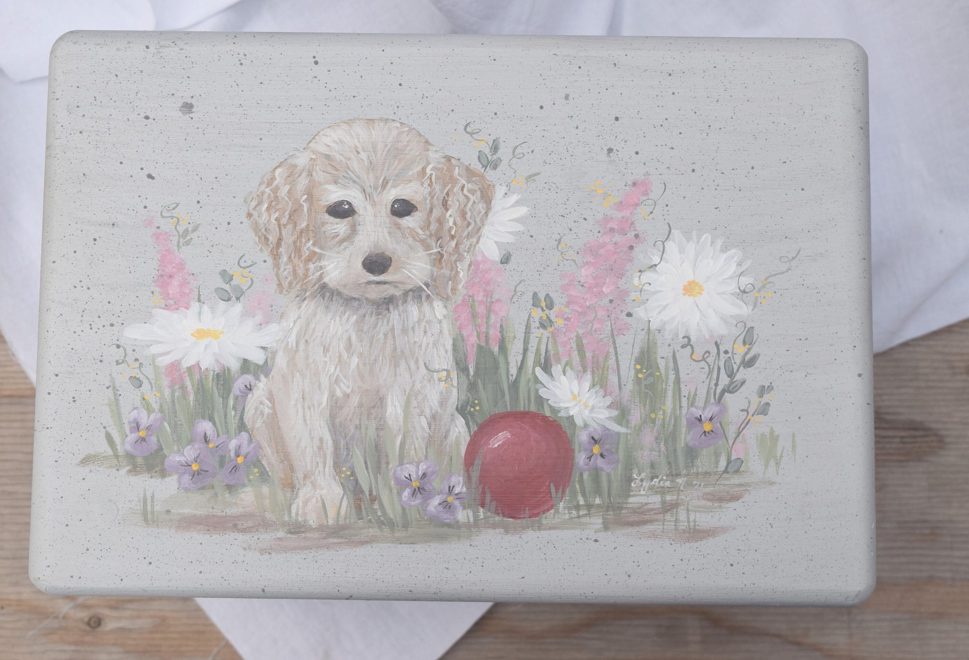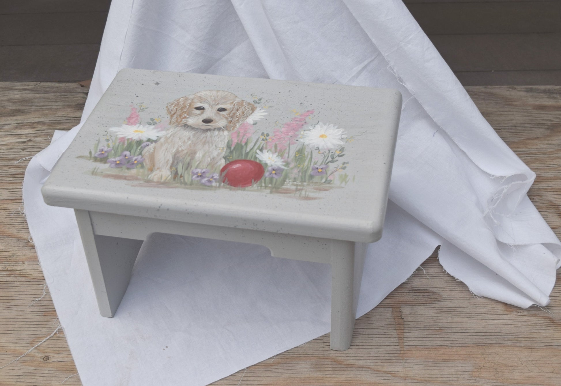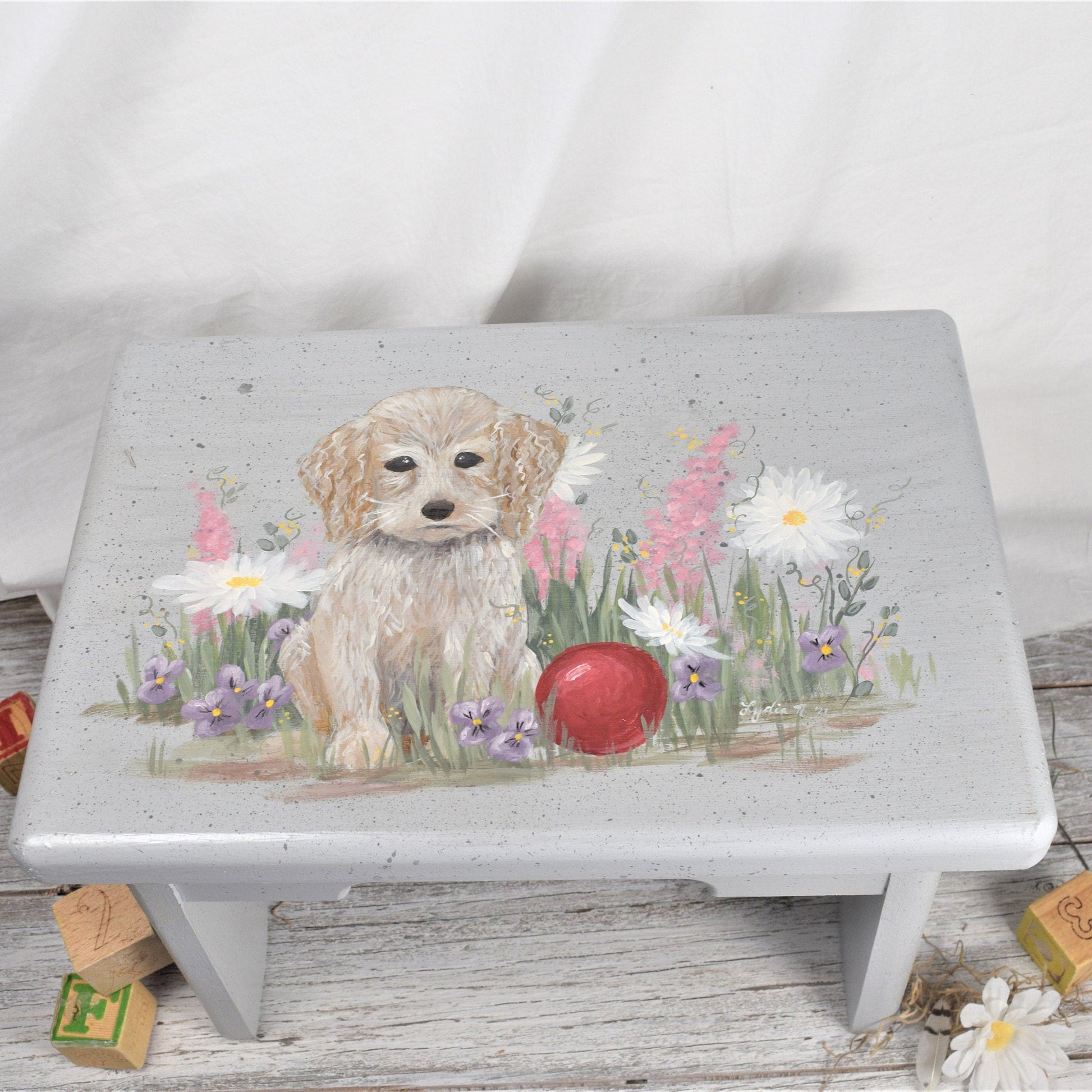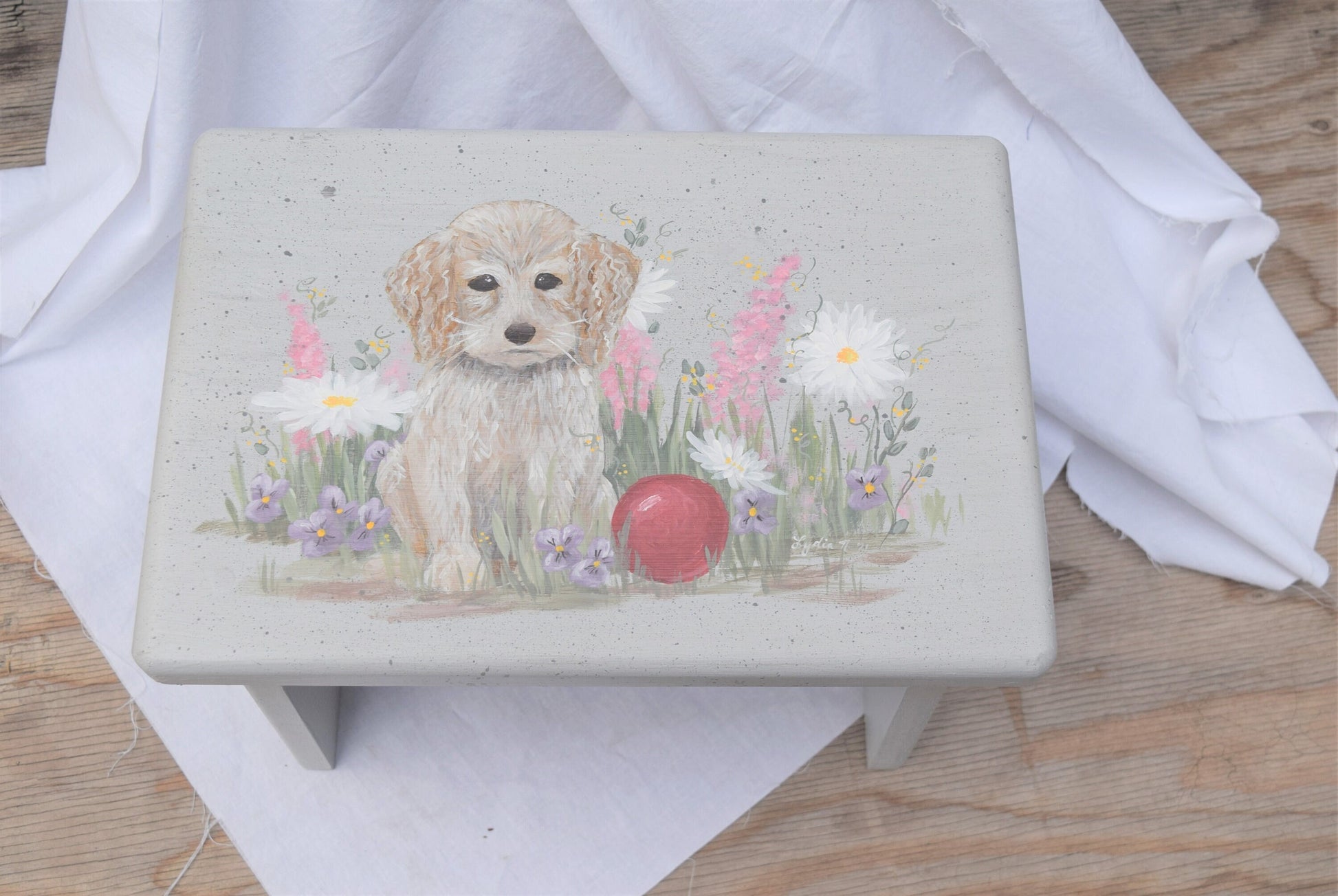 This is a hand painted step stool with a cocker spaniel puppy surrounded by violas, astilbe, and daisies.