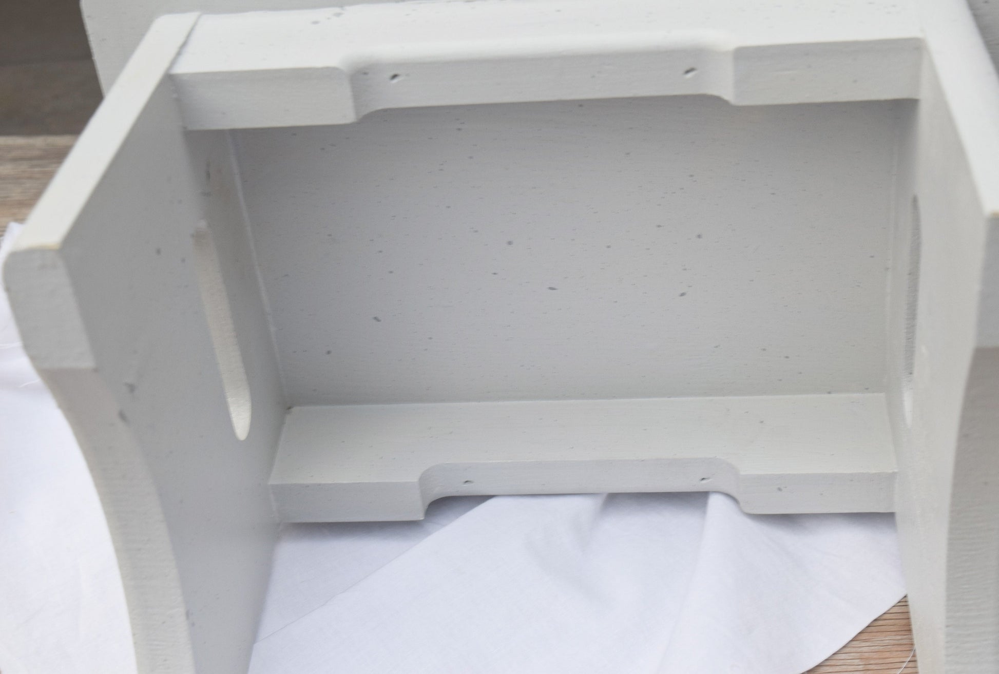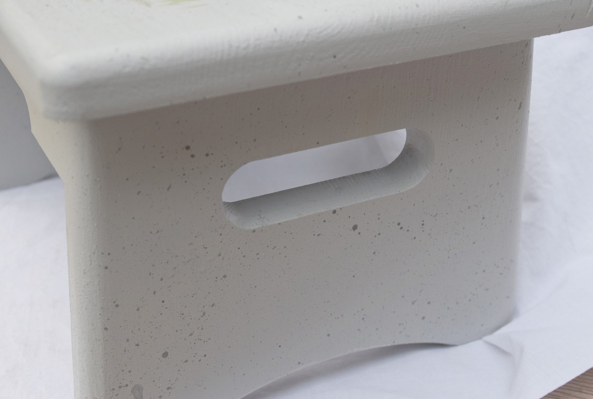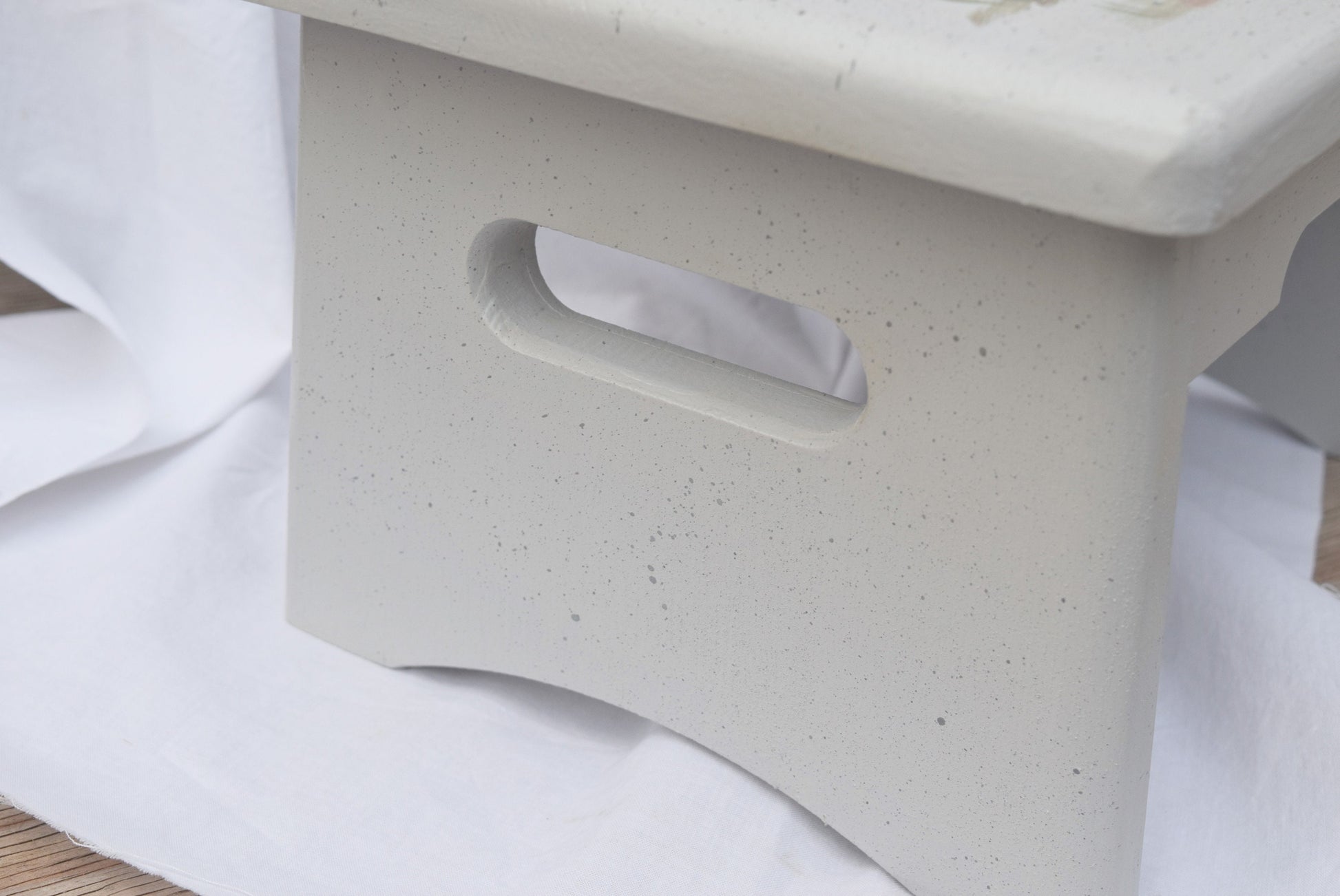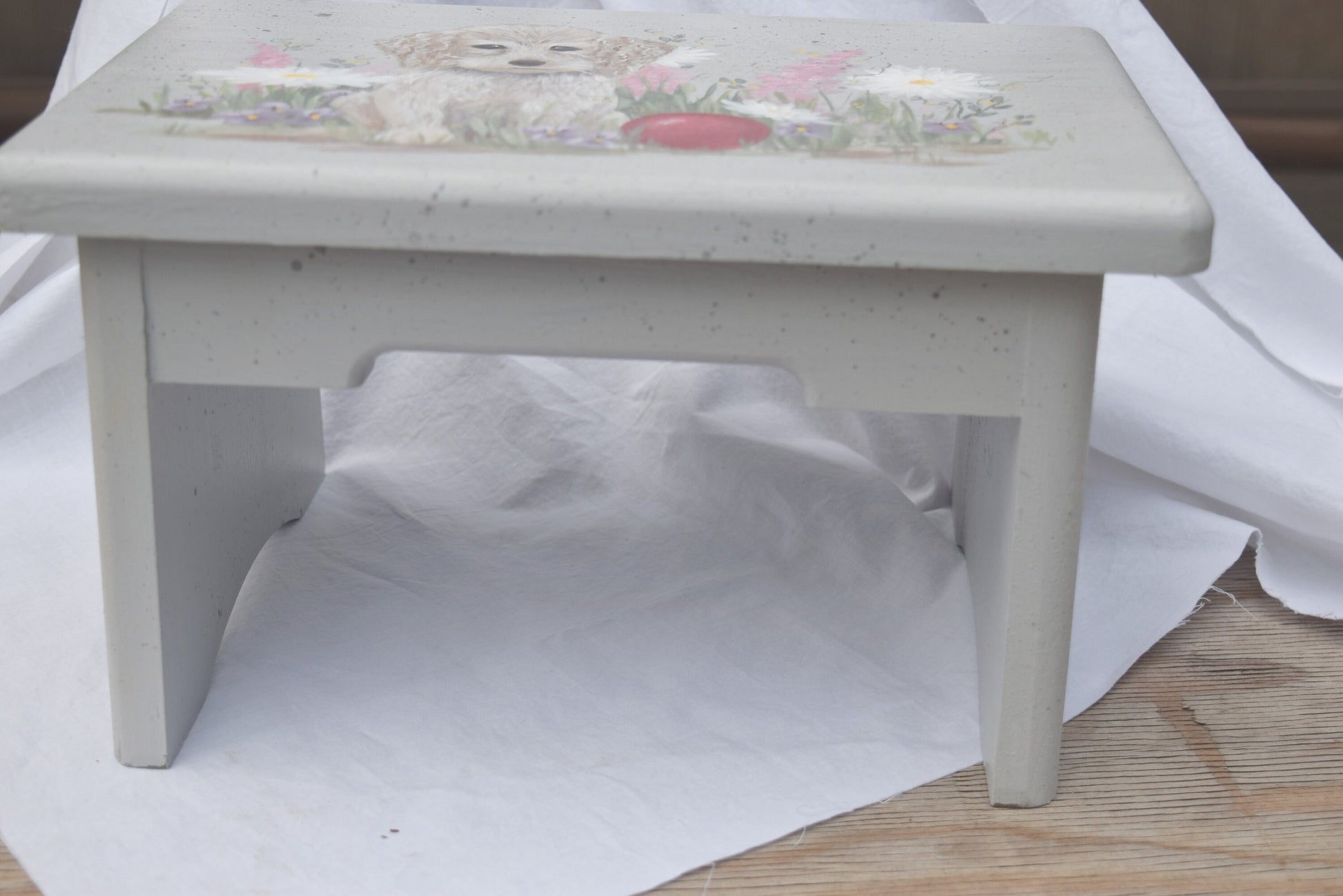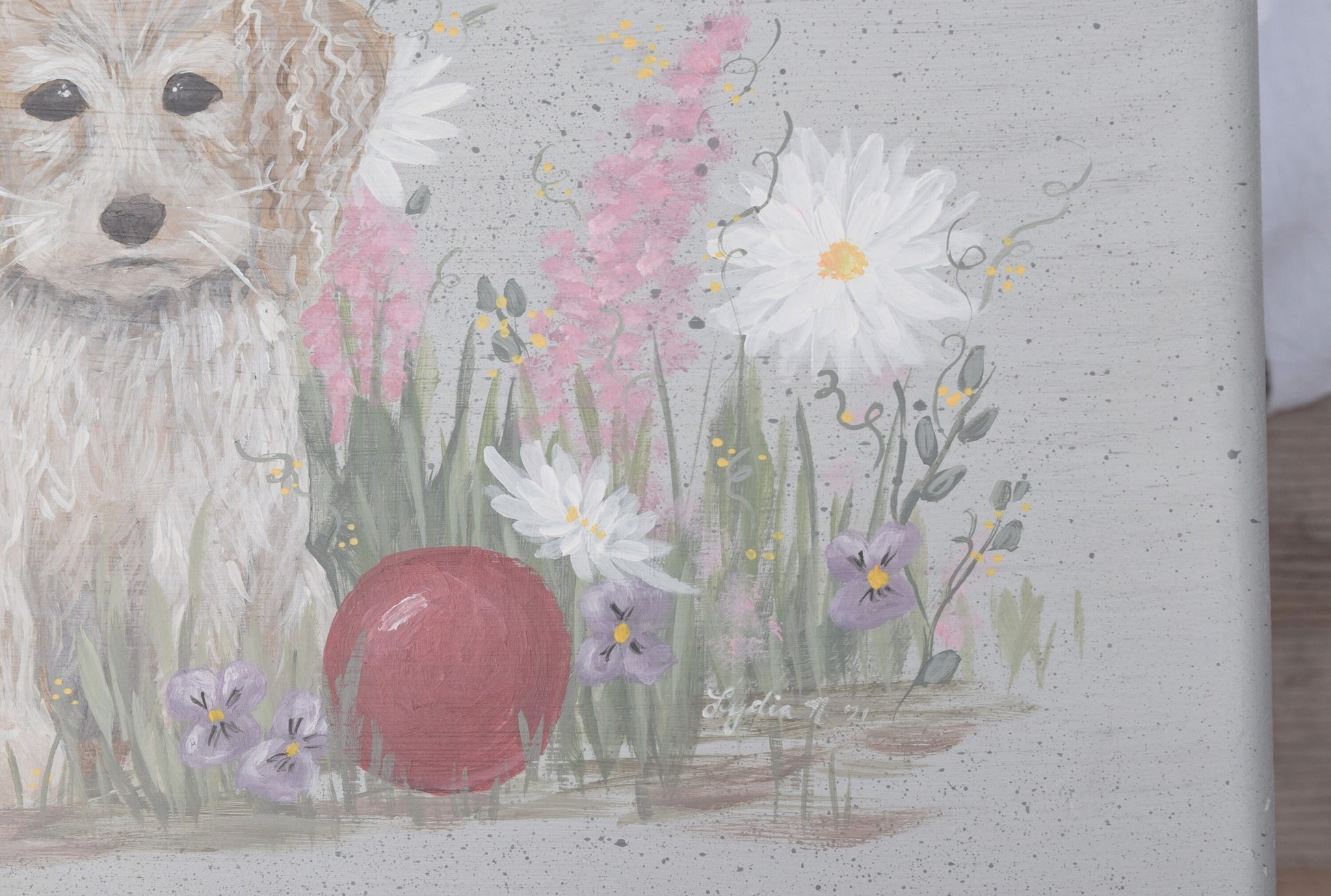 I started with a unfinished wooden stool from a large craft store, and primed it. Then I painted on several coats of light gray paint for the background color. Next I hand drew and painted the dog and flowers. Finally I sealed the stool with a coat of Helmsman spar urethane. This has been signed.
