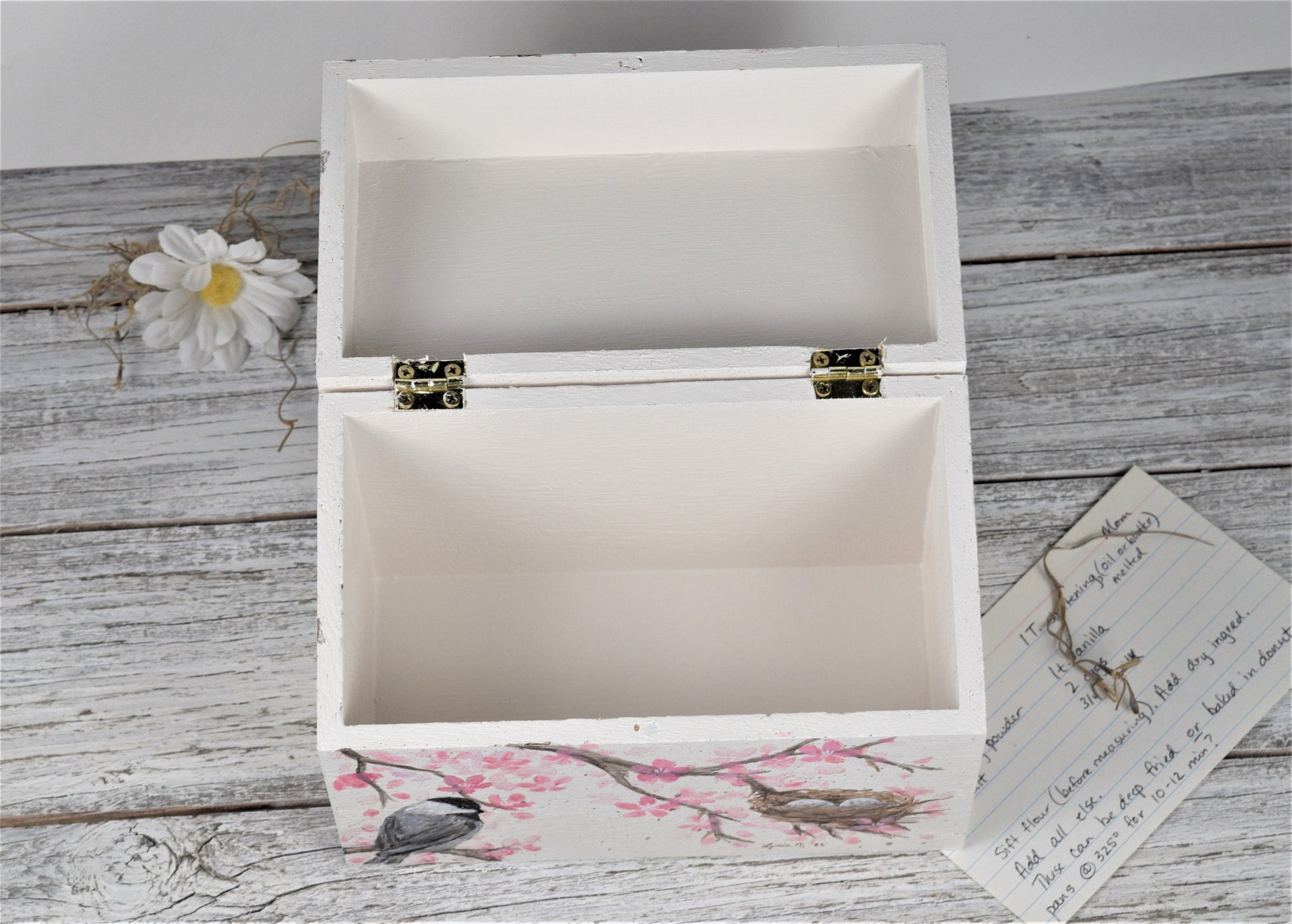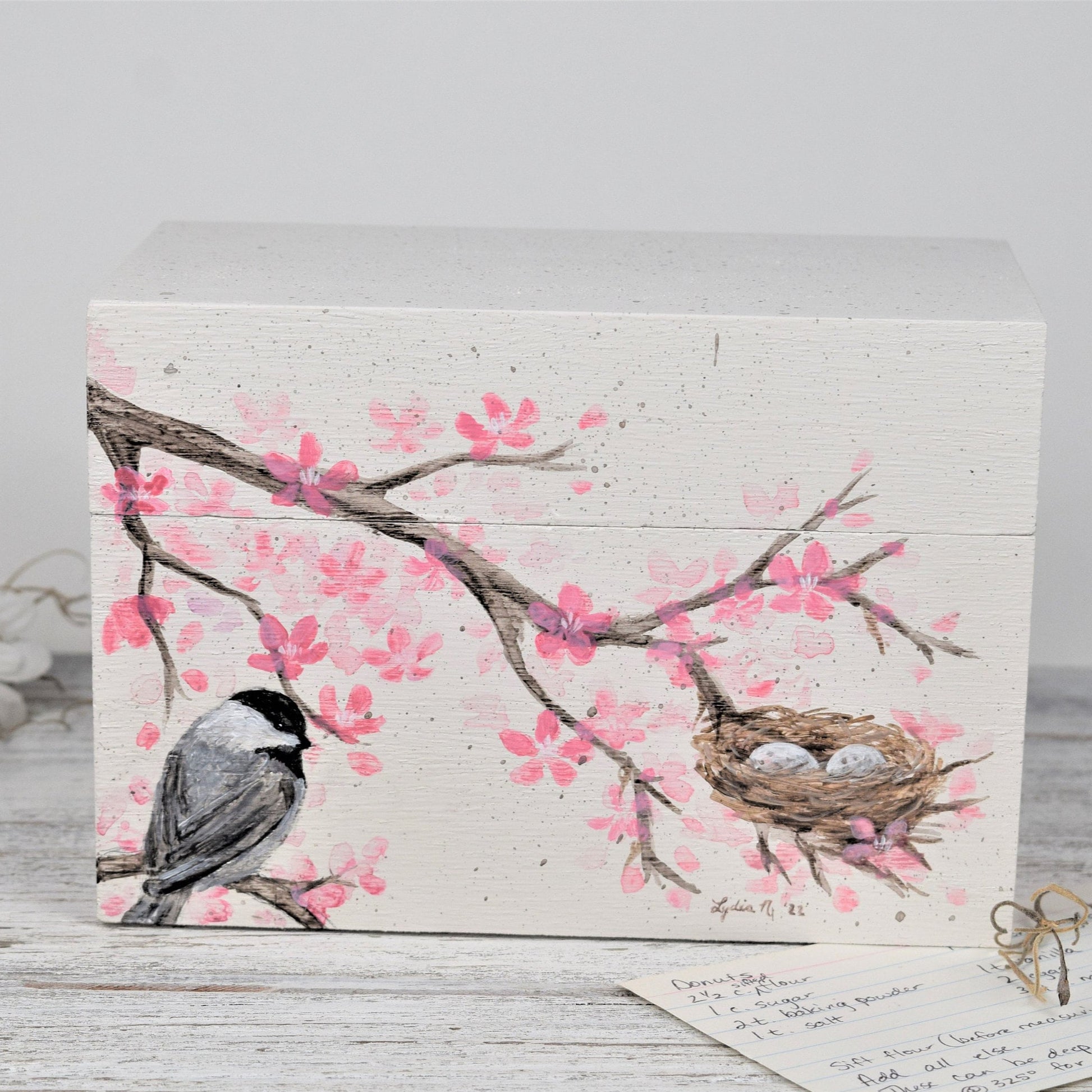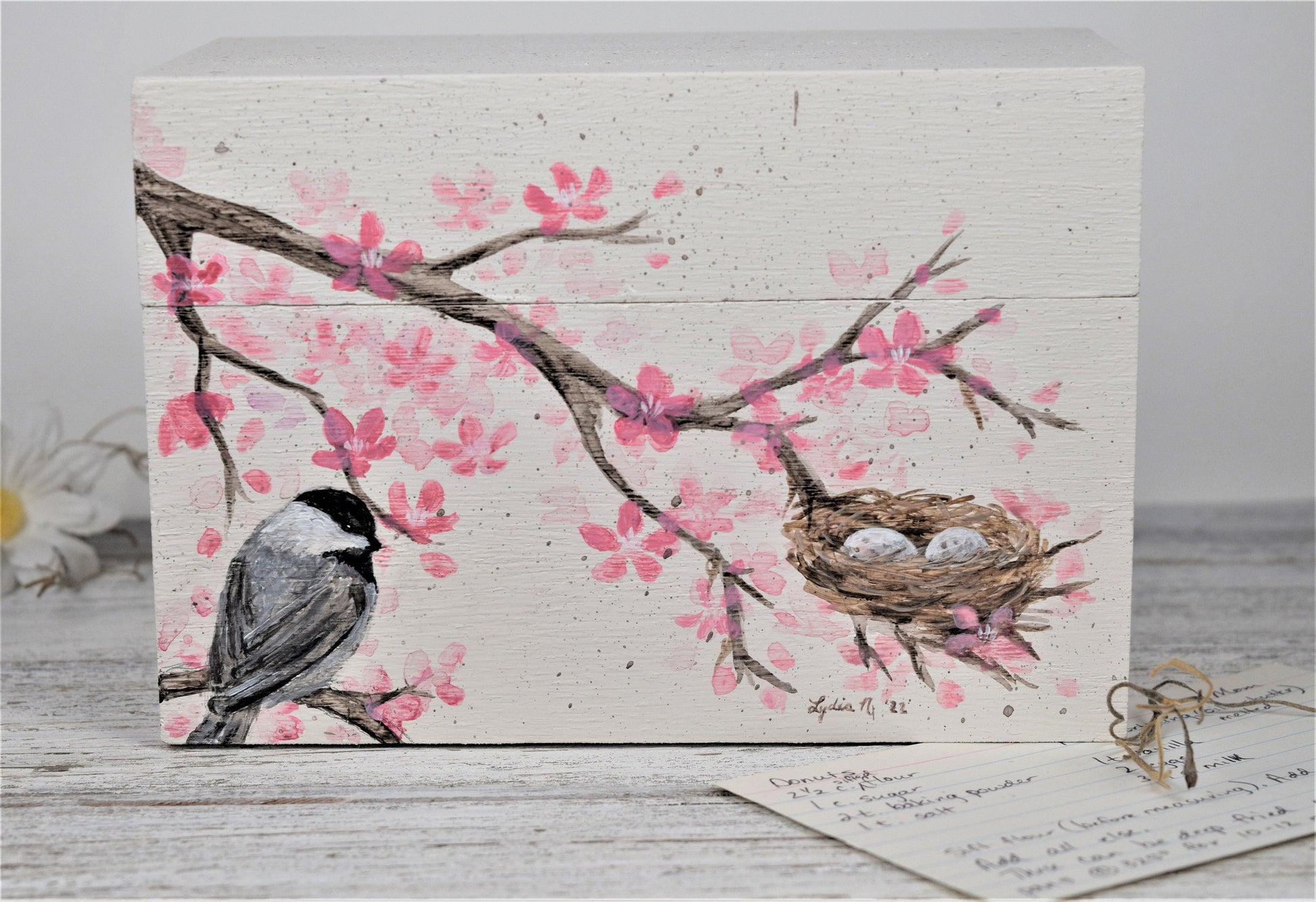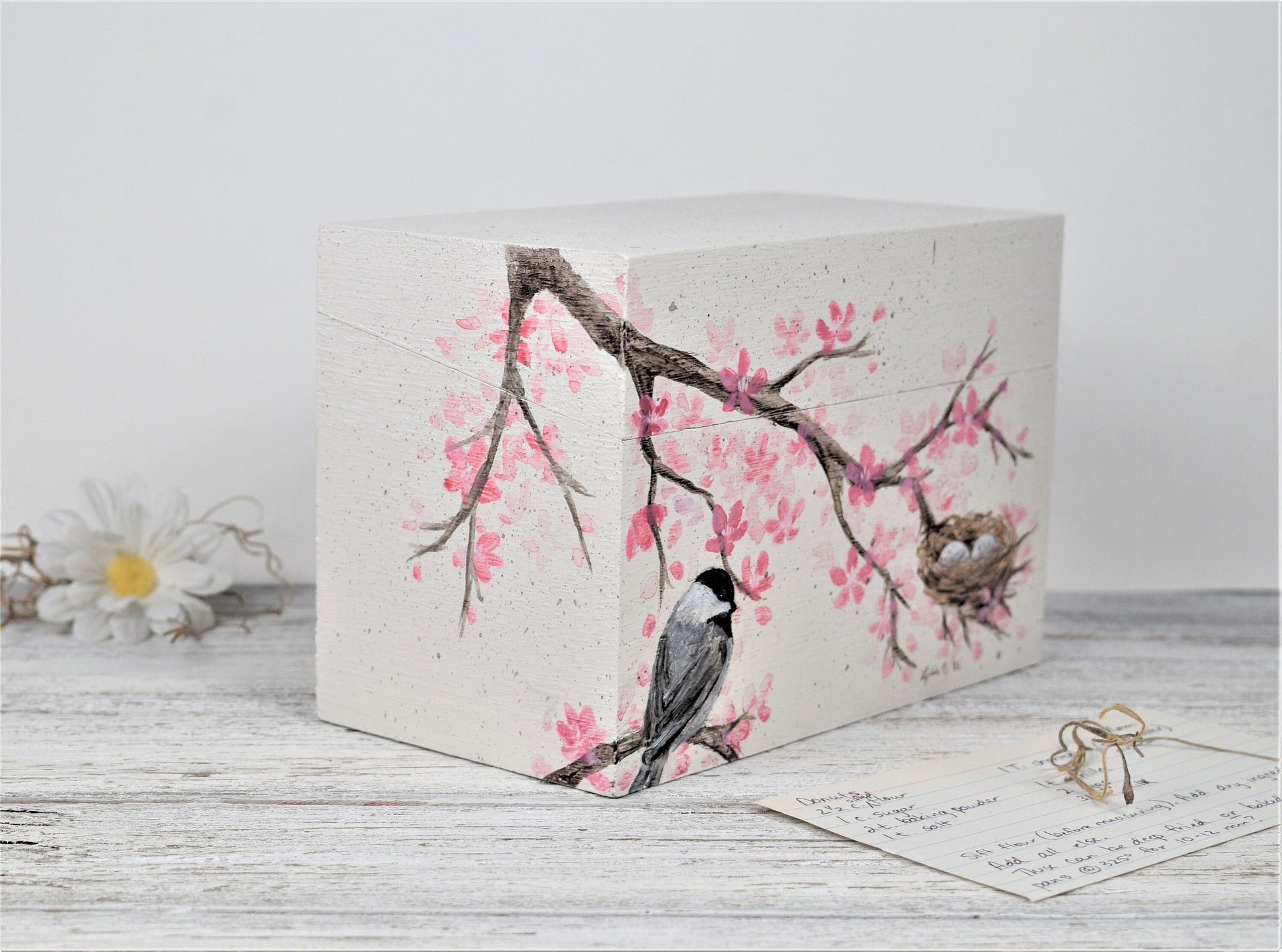 Pink peach blossoms and a chickadee are painted on this recipe box, with a speckled white background. It fits standard sized 4 x 6 recipe cards, which makes it perfect for gifting or for your own kitchen decor!