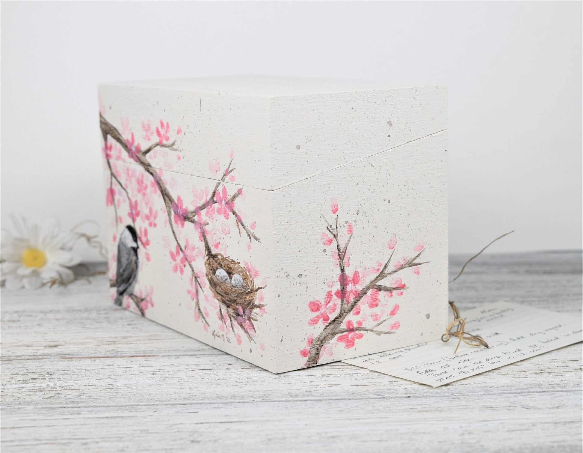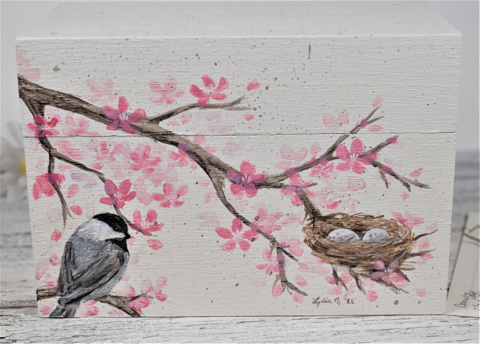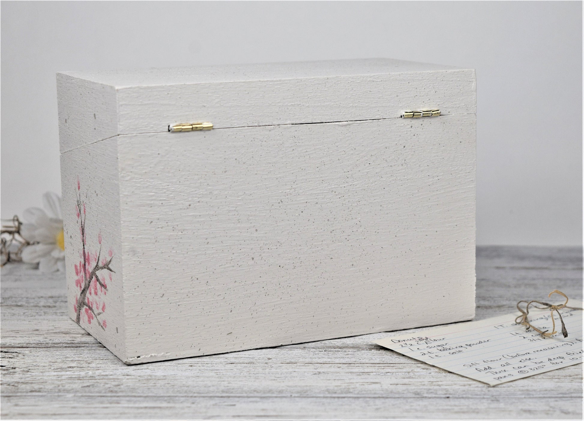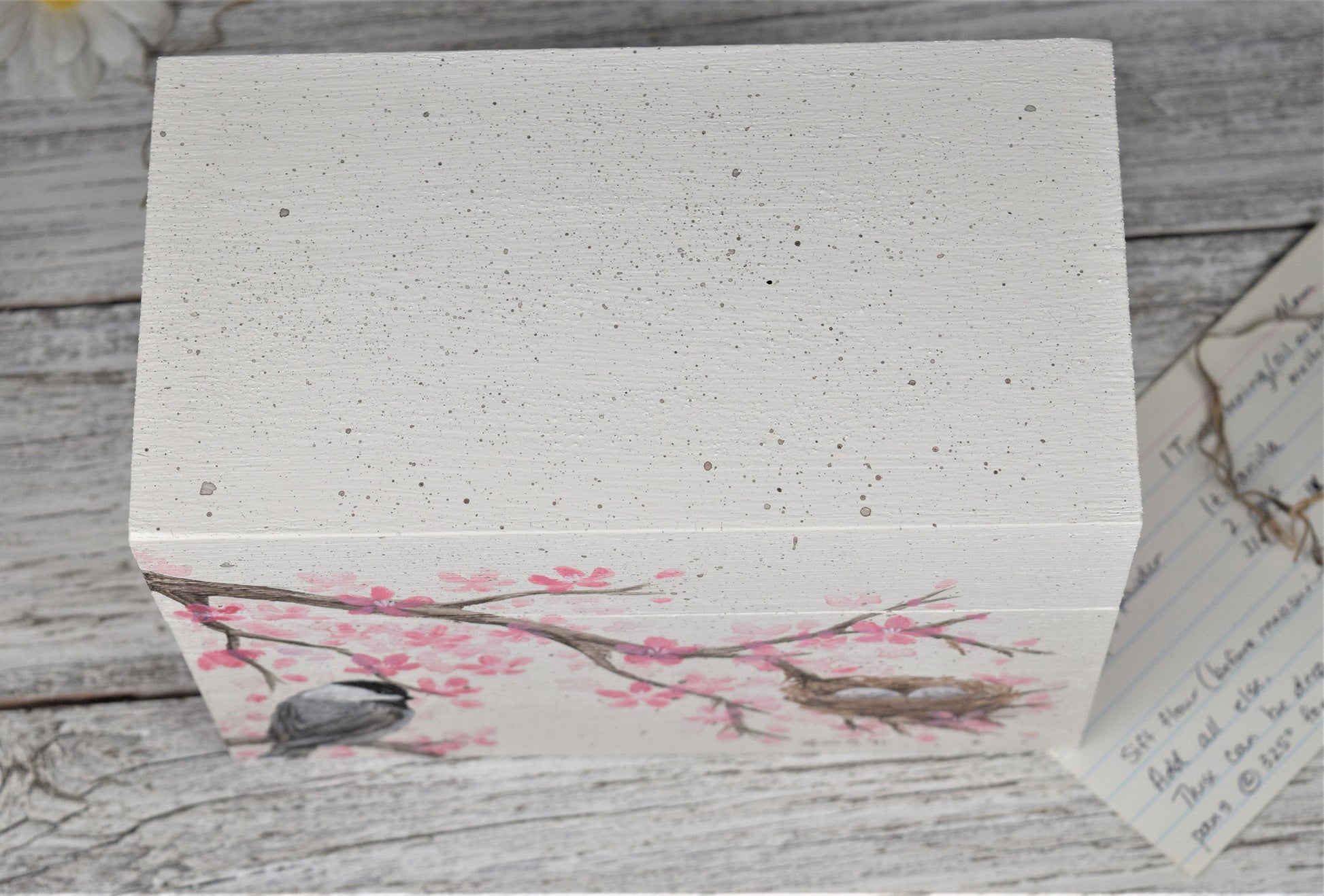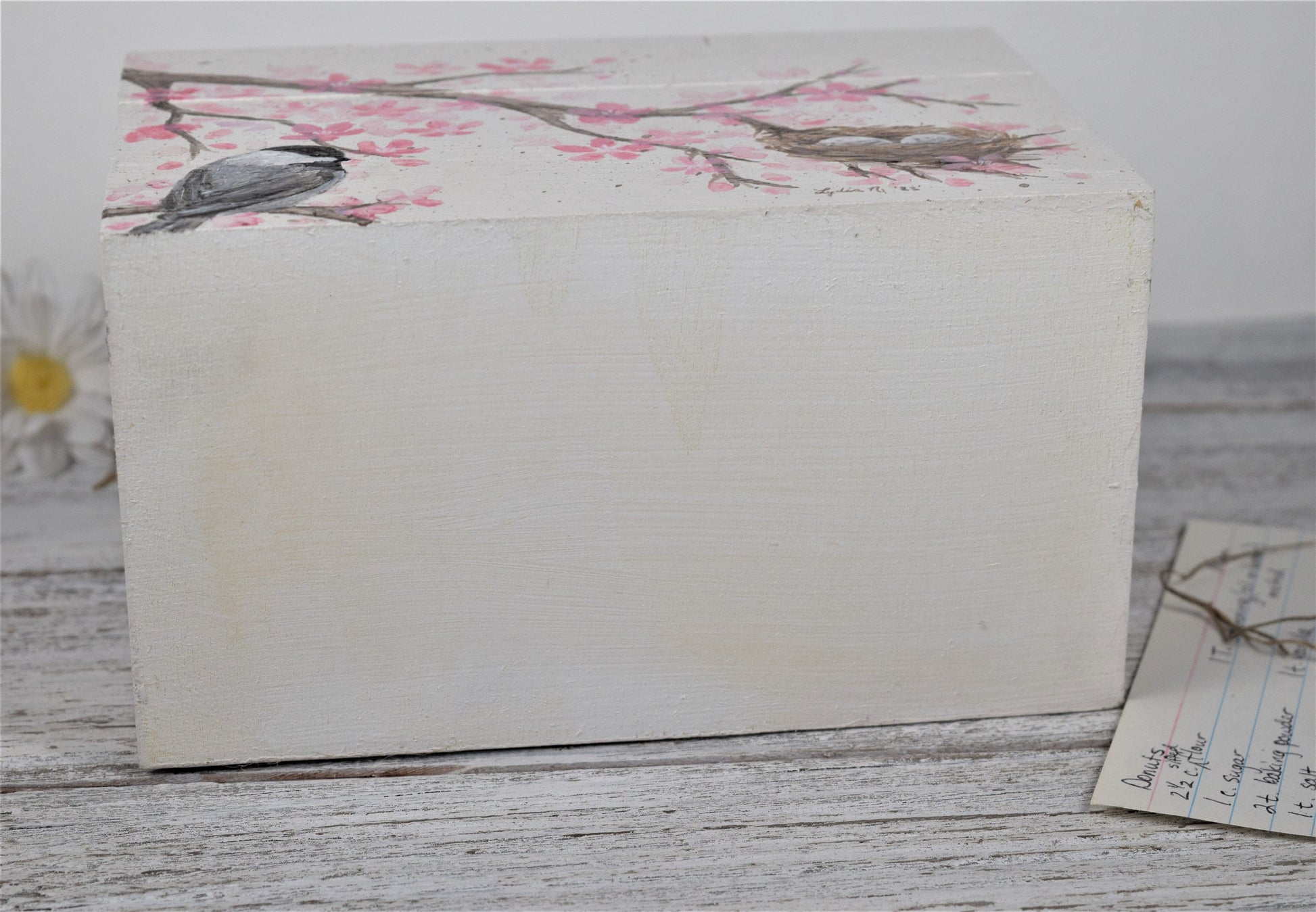 Pink peach blossoms and a chickadee are painted on this recipe box, with a speckled white background. It fits standard sized 4 x 6 recipe cards, which makes it perfect for gifting or for your own kitchen decor!