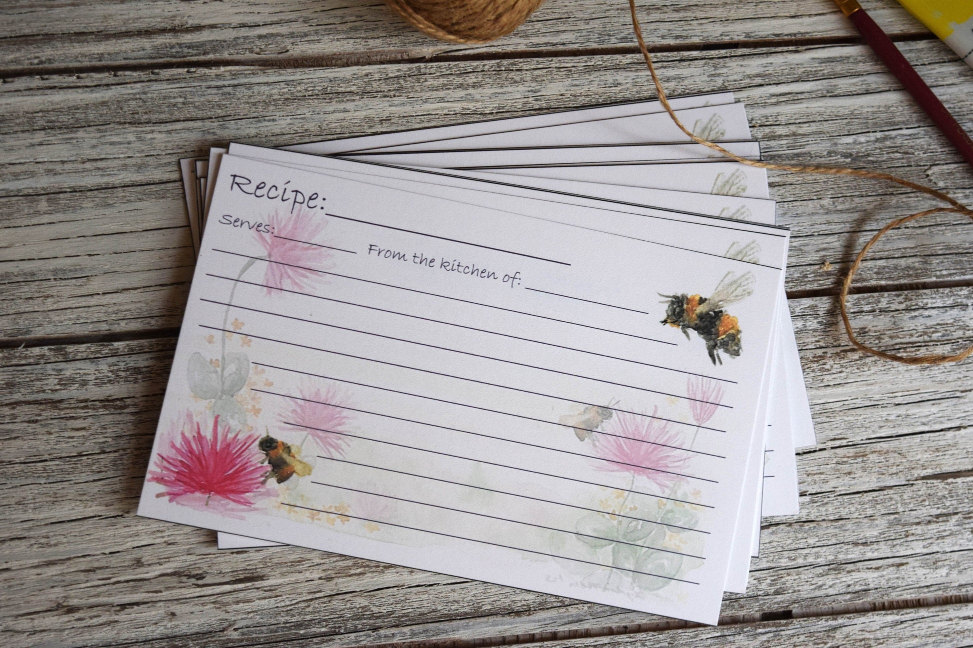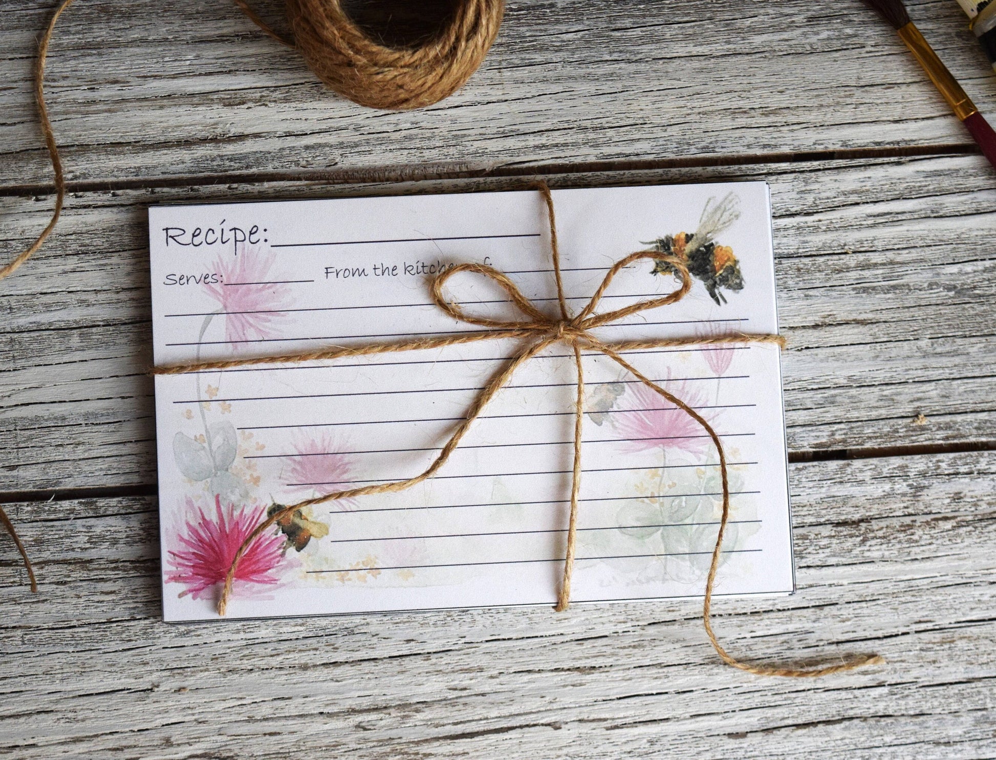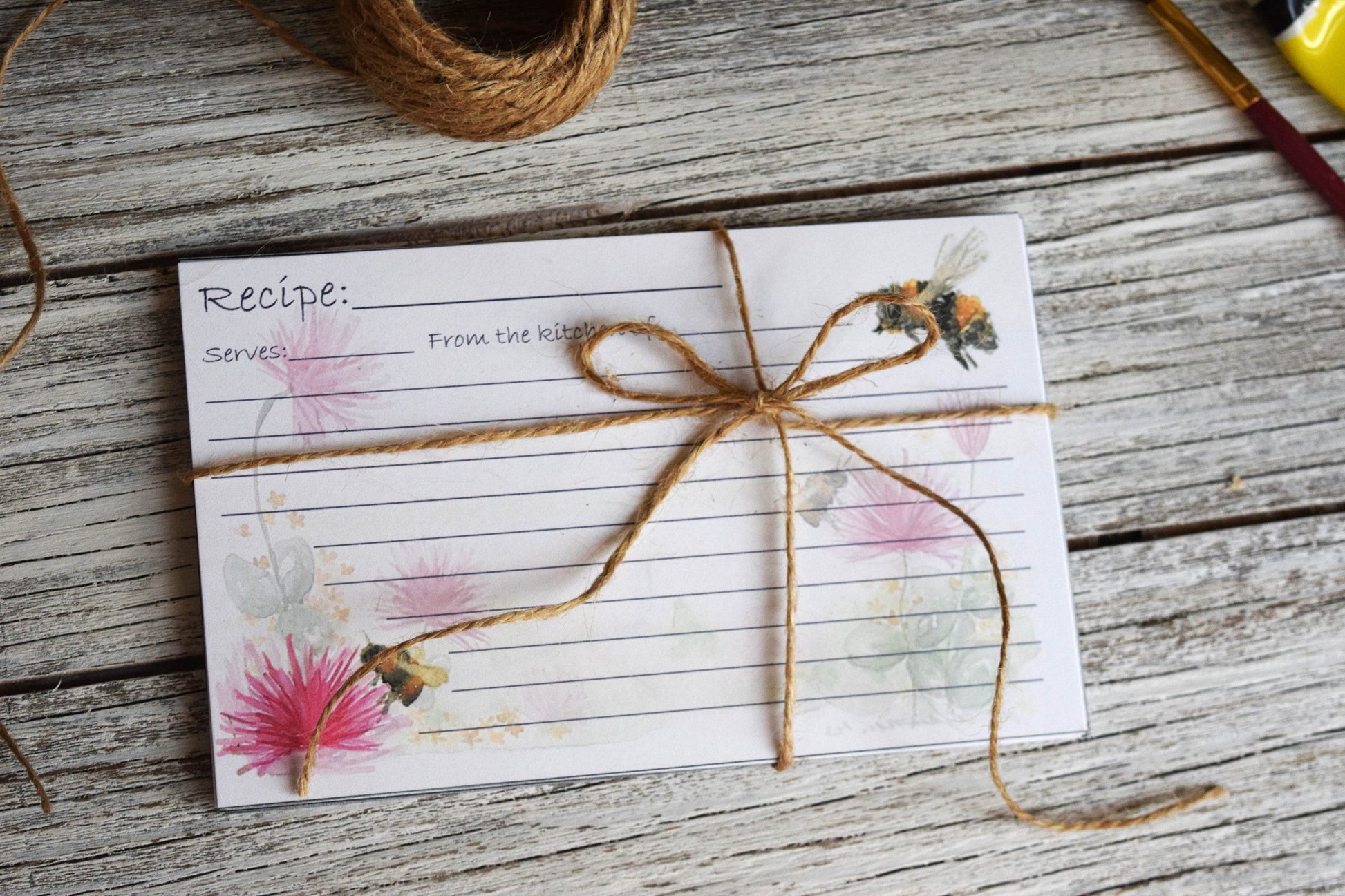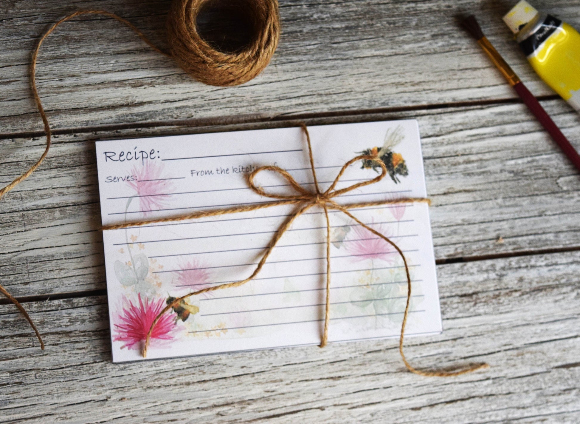 This recipe card set includes 40 double sided cards, with a watercolor painting of clover and bumblebees. Each recipe card starts with a hand painting that is scanned, designed, then printed and hand cut just for you!