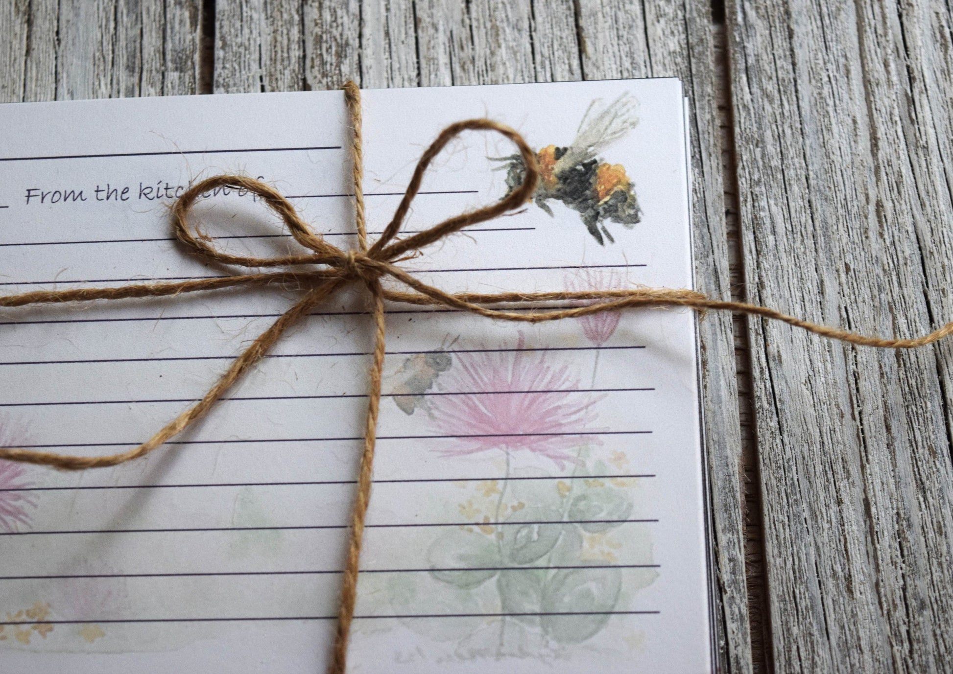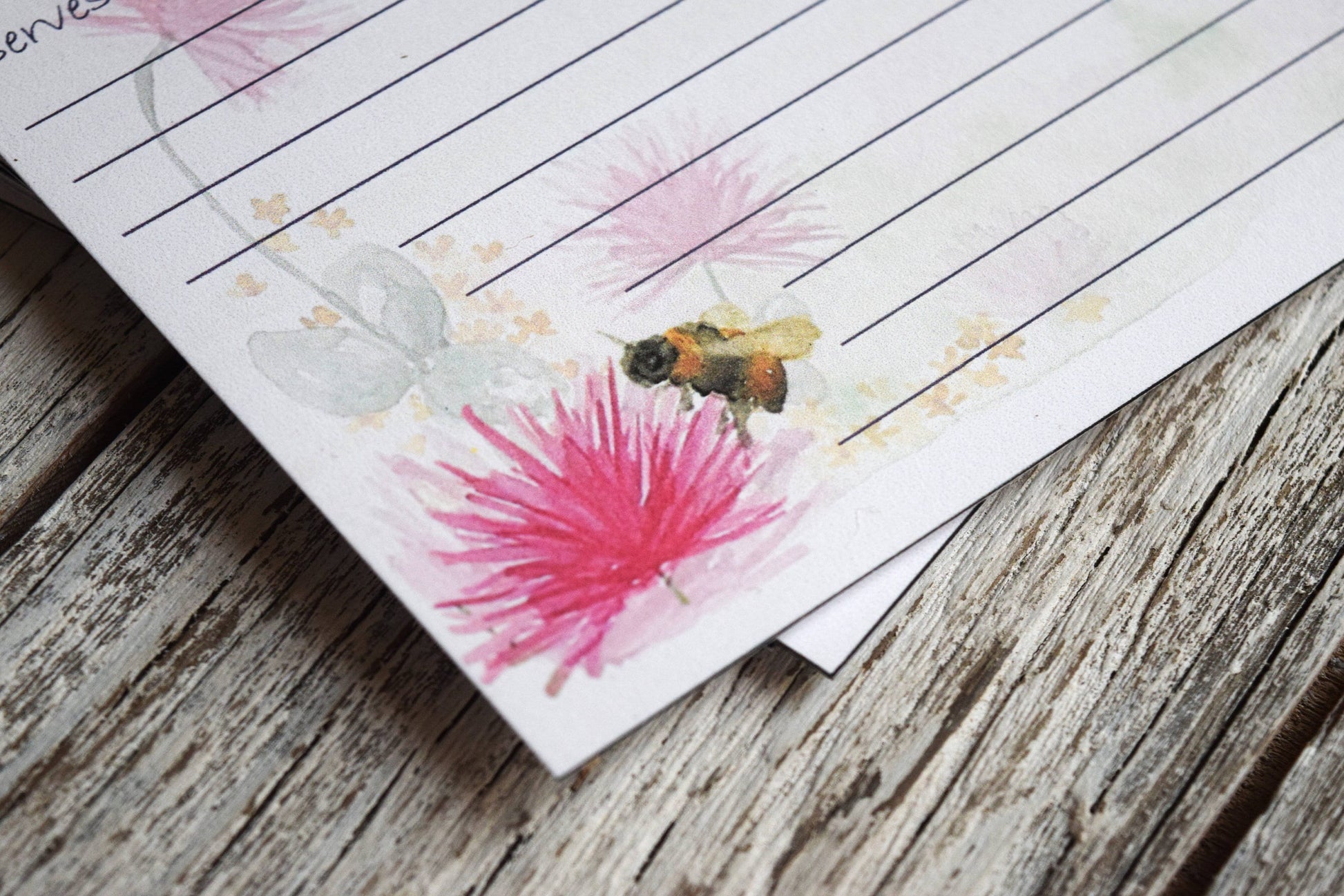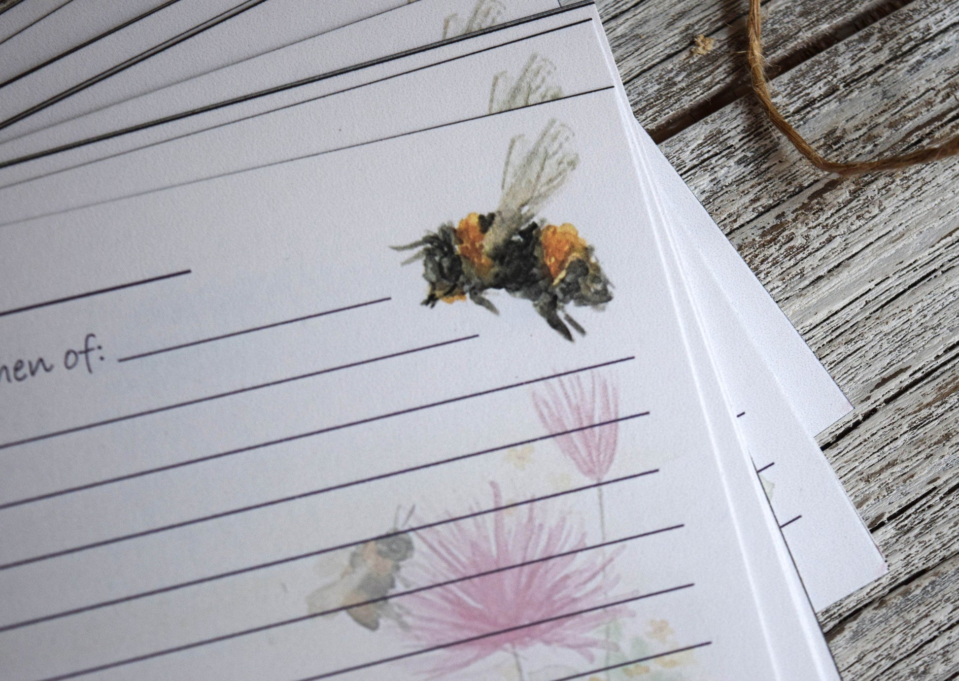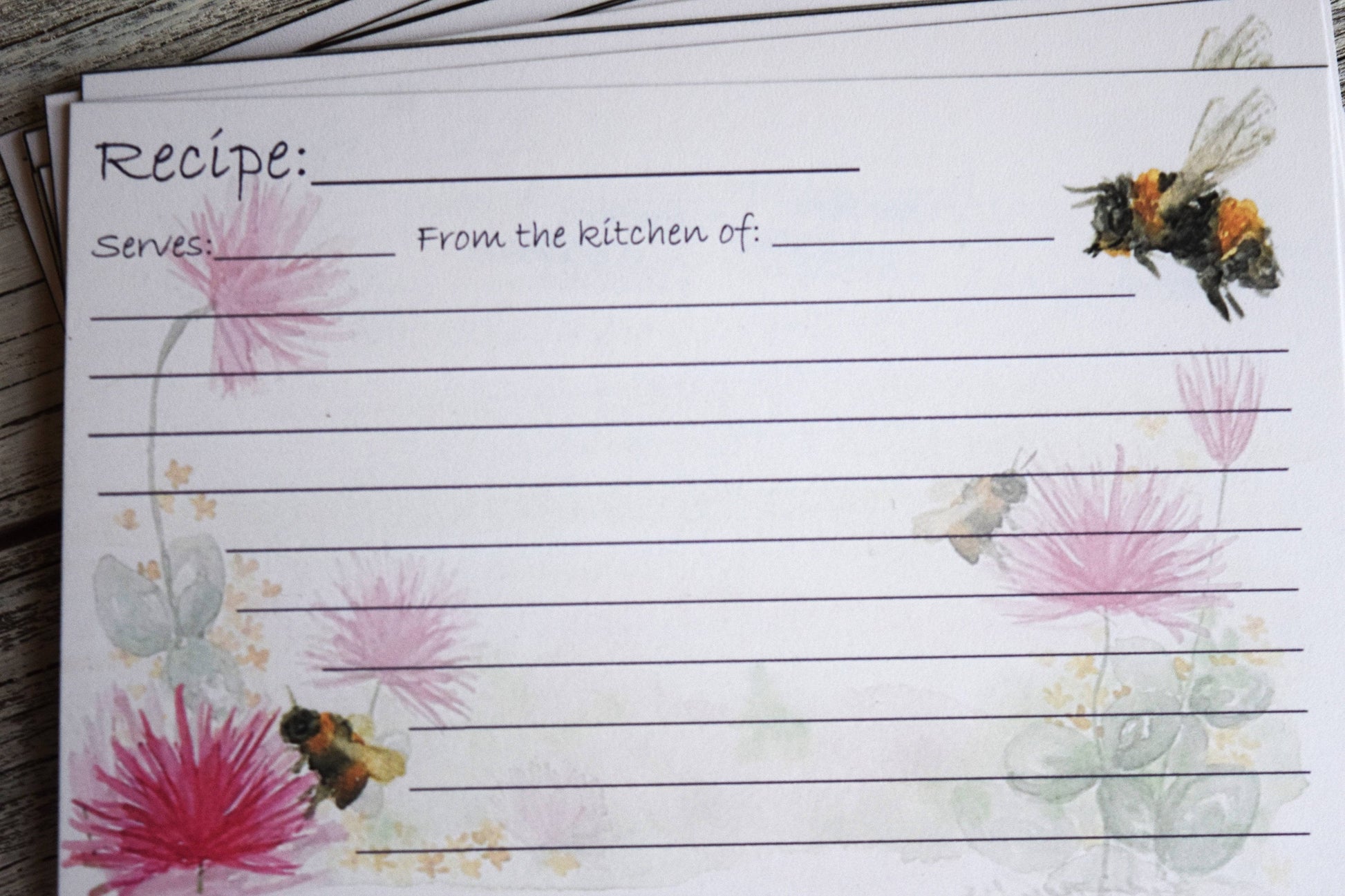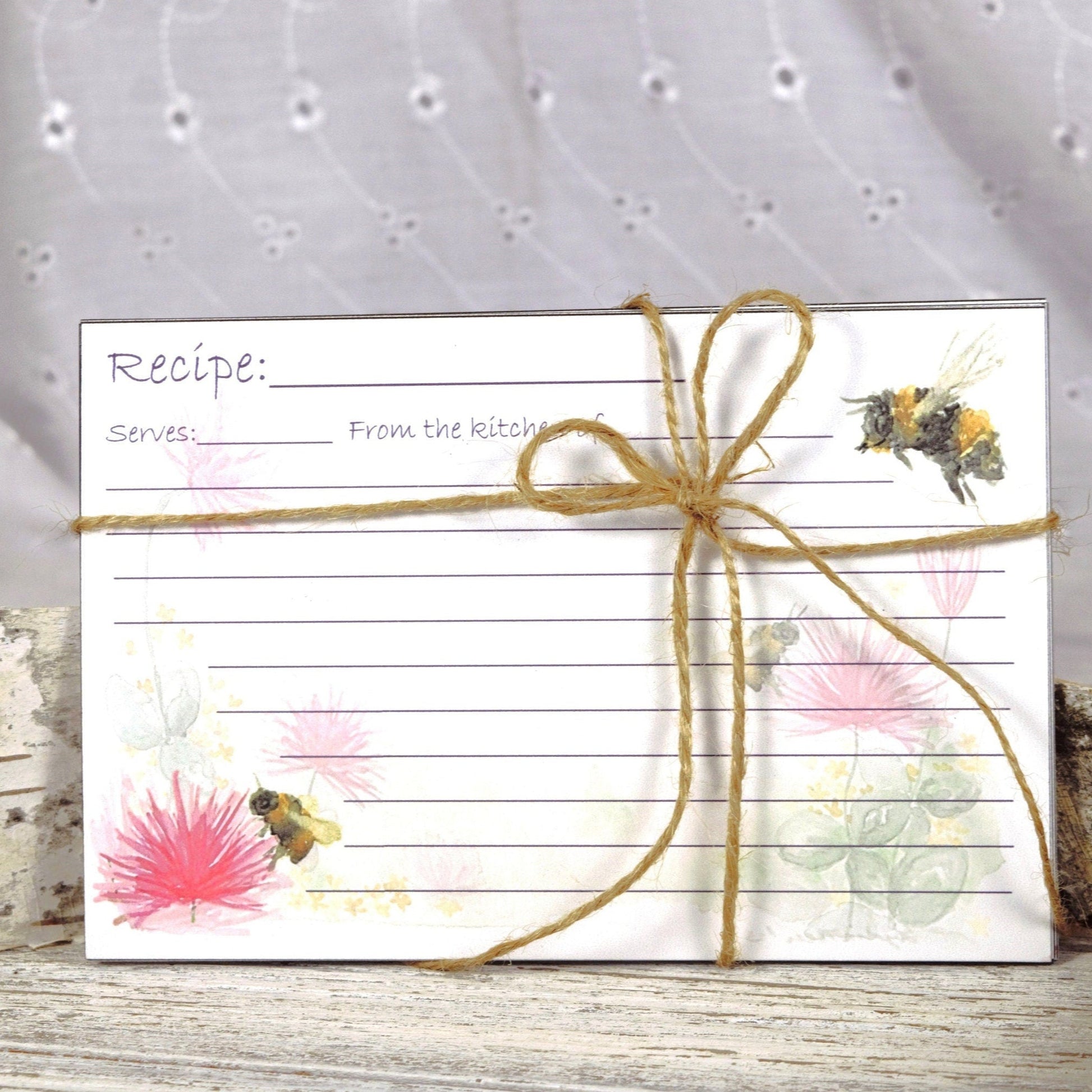 This recipe card set includes 40 double sided cards, with a watercolor painting of clover and bumblebees. Each recipe card starts with a hand painting that is scanned, designed, then printed and hand cut just for you!
