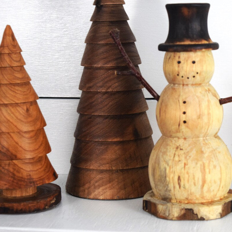 This set of winter-themed decor is lathed by hand on a machine, each one unique. Picture for reference only. Wood types may vary, but are typically as follows: Maple or birch wood for snowman, black walnut and cherry wood for the trees. Actual item received may or MAY NOT have the live edge at the base. It is dependent on each piece of wood, and whether the bark edge is stable enough. Sometimes it just doesn't work out to leave the bark on. Thank you for your flexibility!