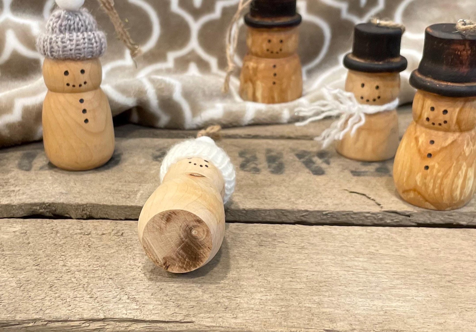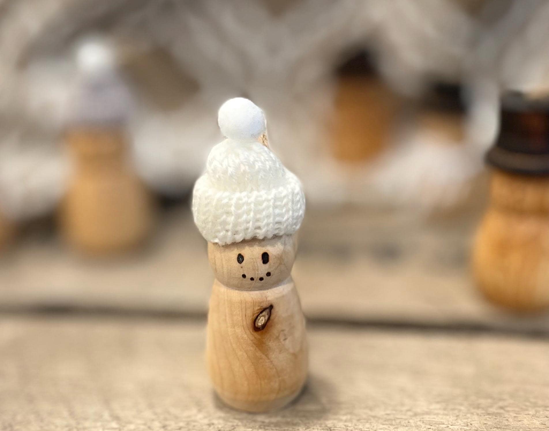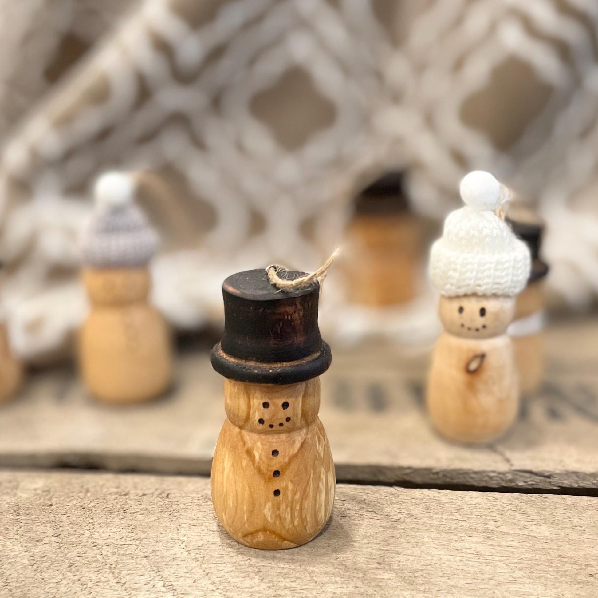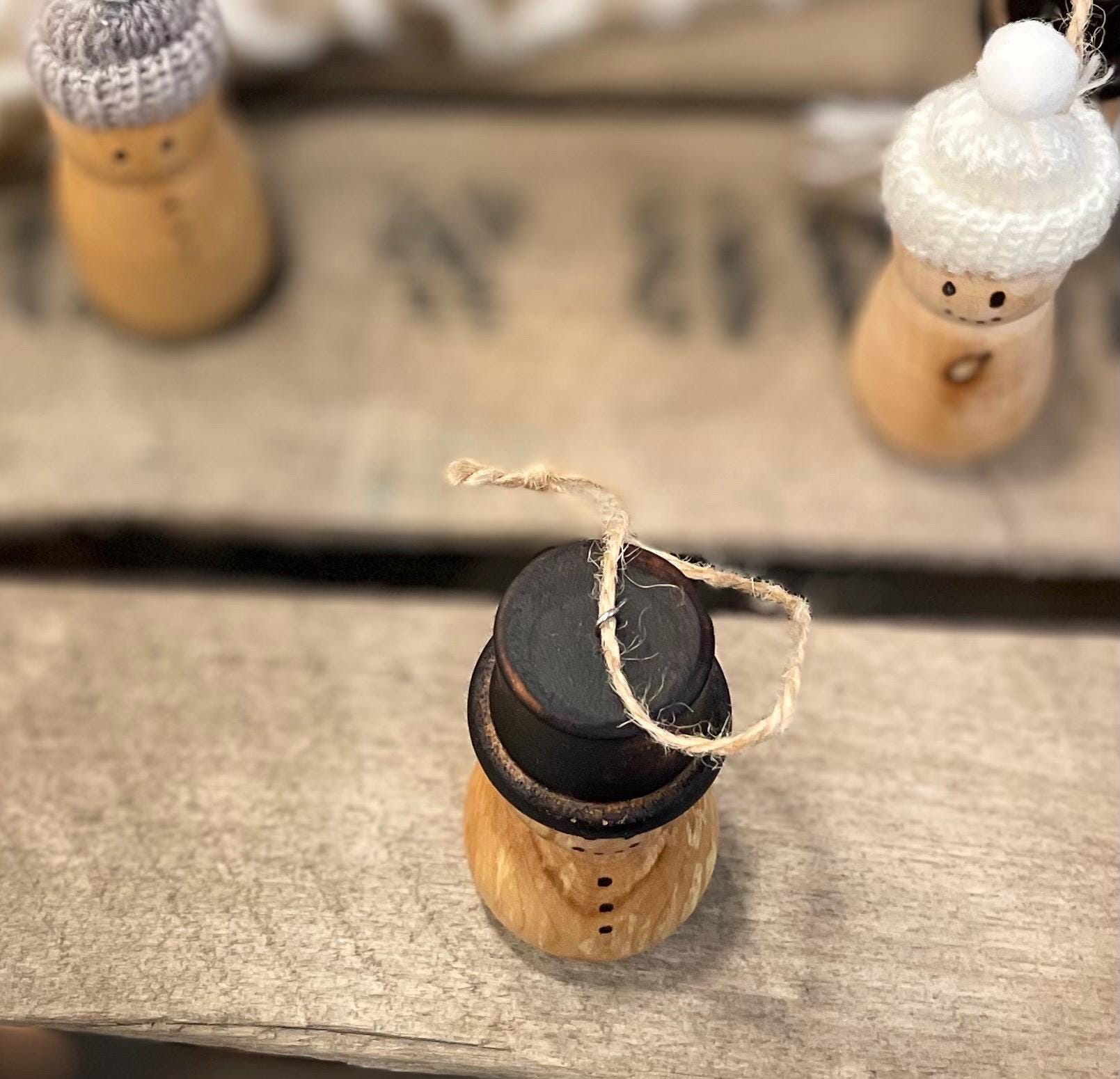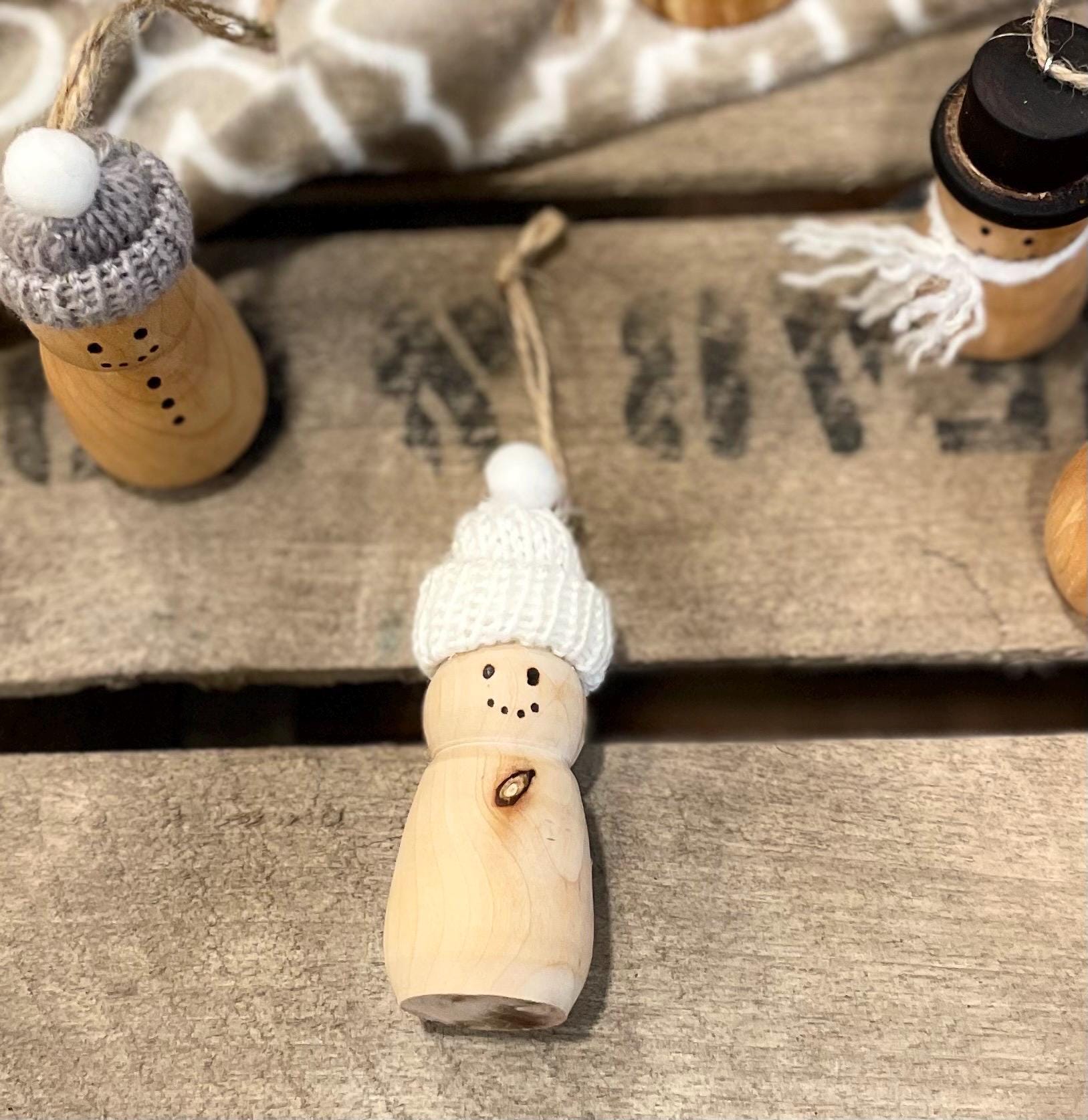 The hat on the snowman is torched to give it the traditional black color, and the eyes/mouth are created with a woodburning/pyrography pen. Small hook and jute string also included for hanging.