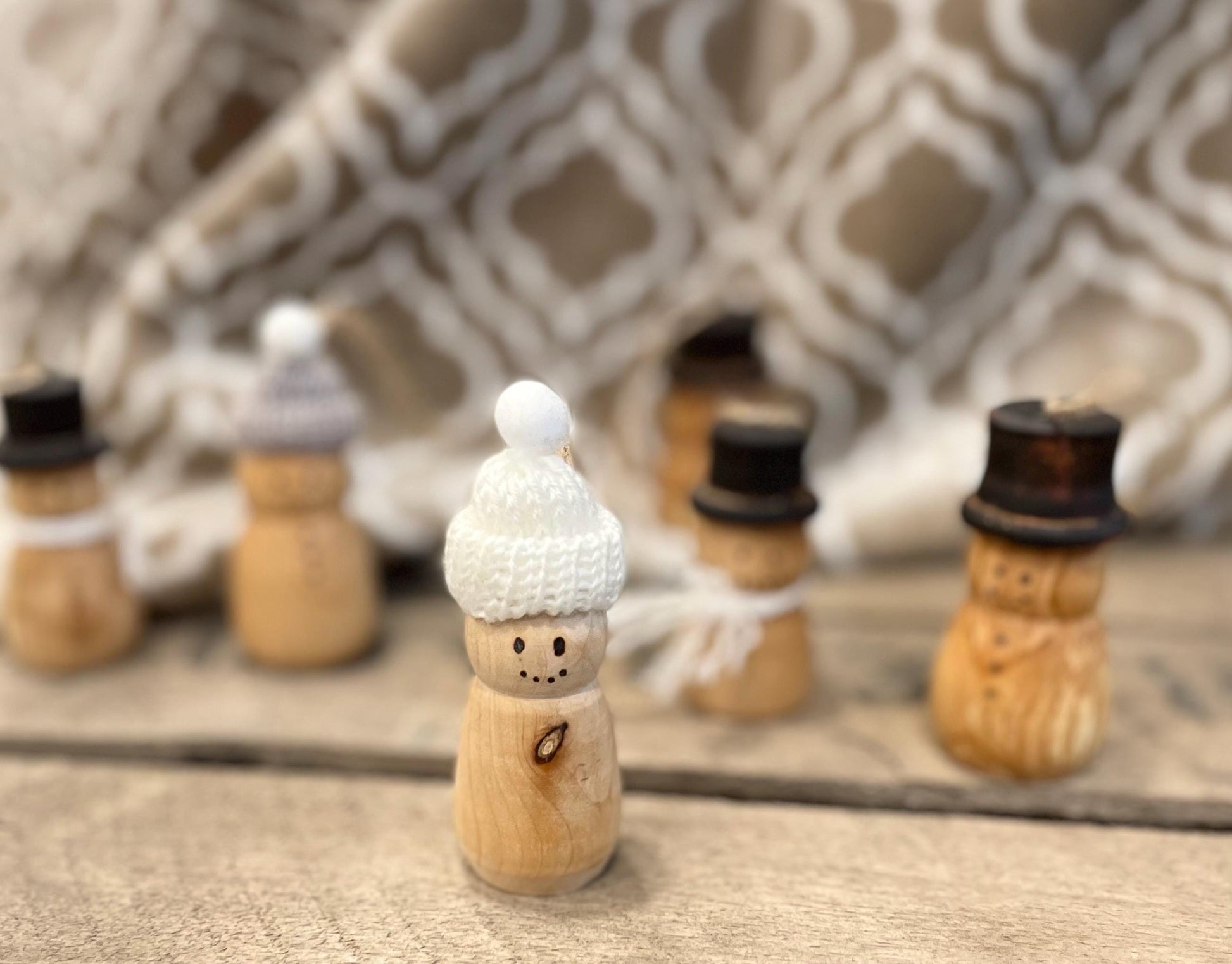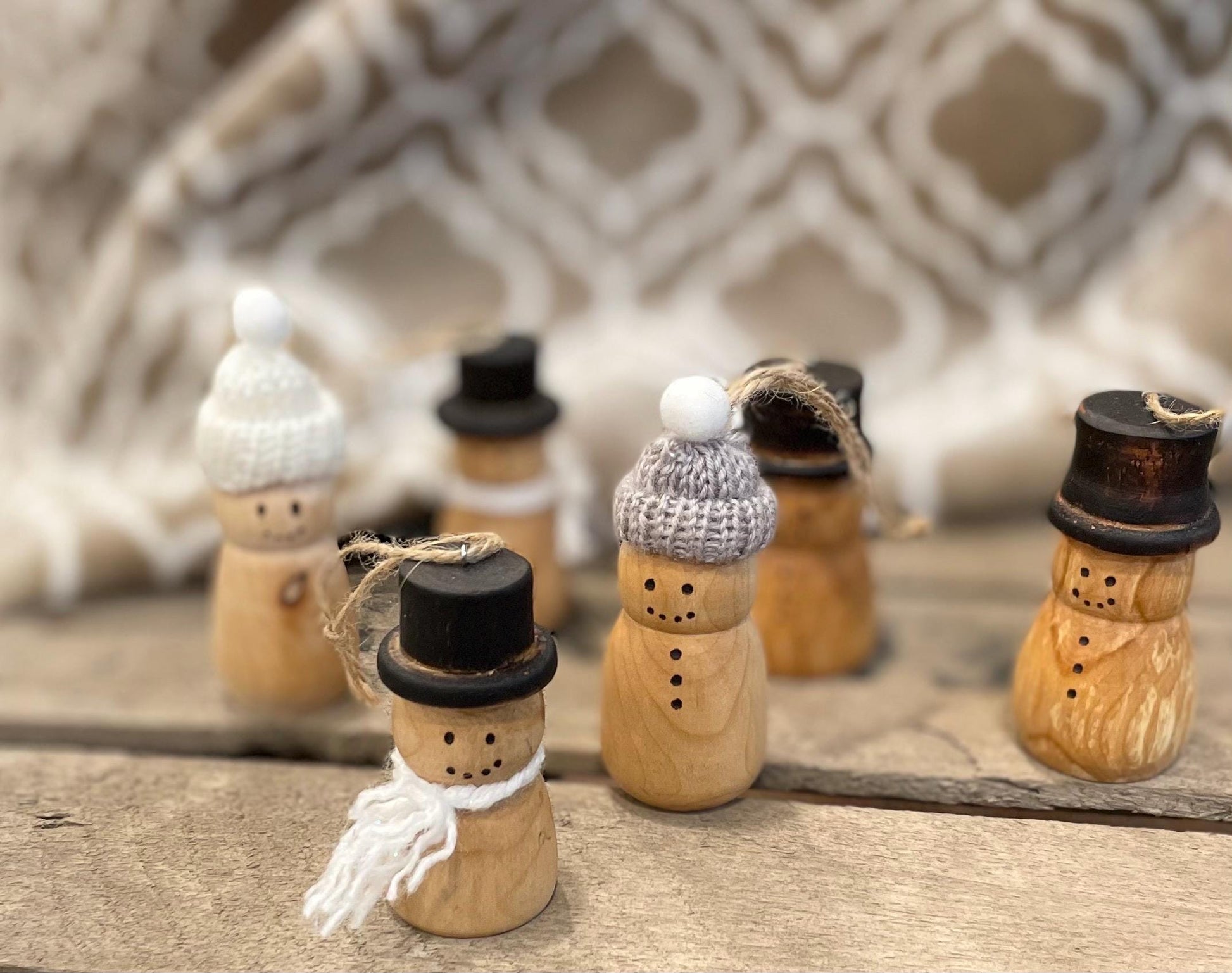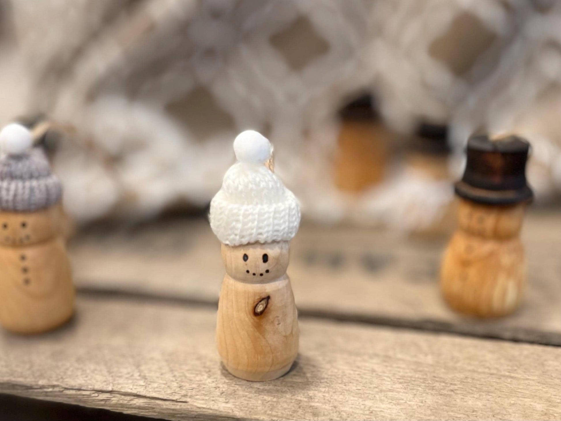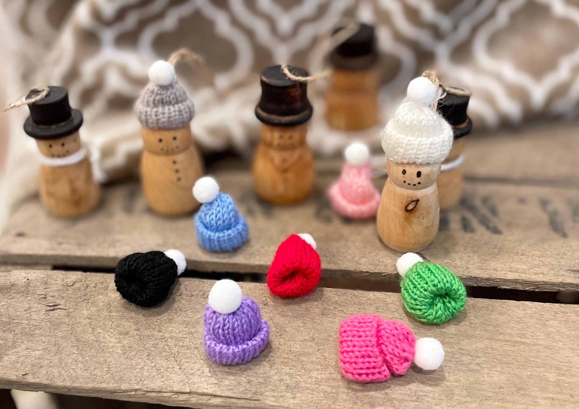 The big snowmen have been such a hit that I just had to make this addition to my shop! These ornament sized snowmen are on average 2"-3" tall and are perfect for hanging just about anywhere. They come with either the traditional top hat or with colored knitted hats.