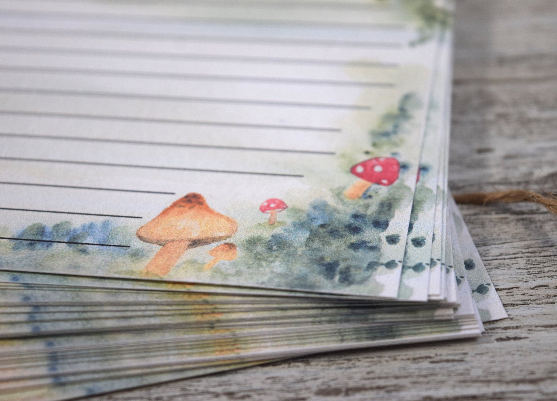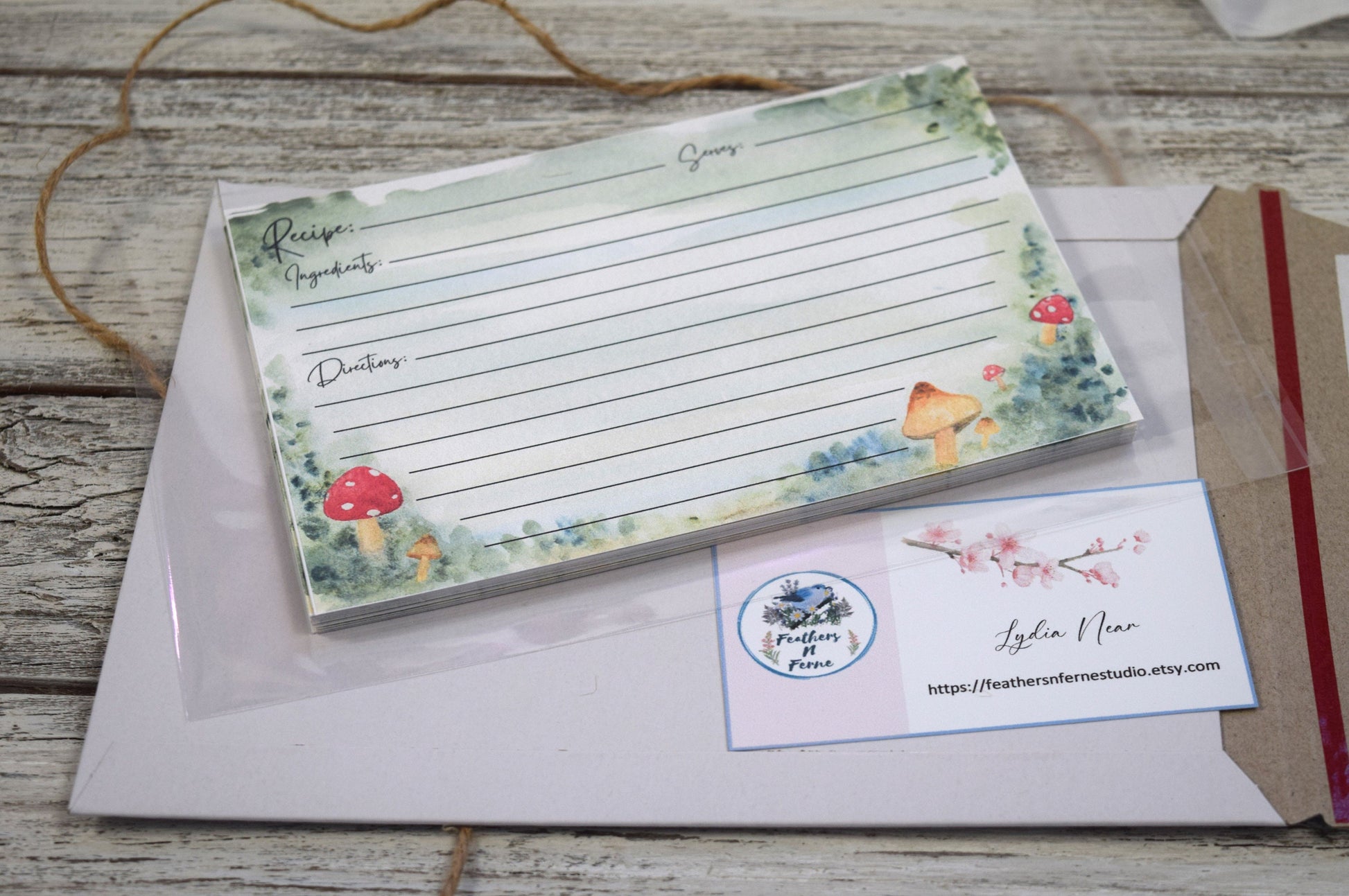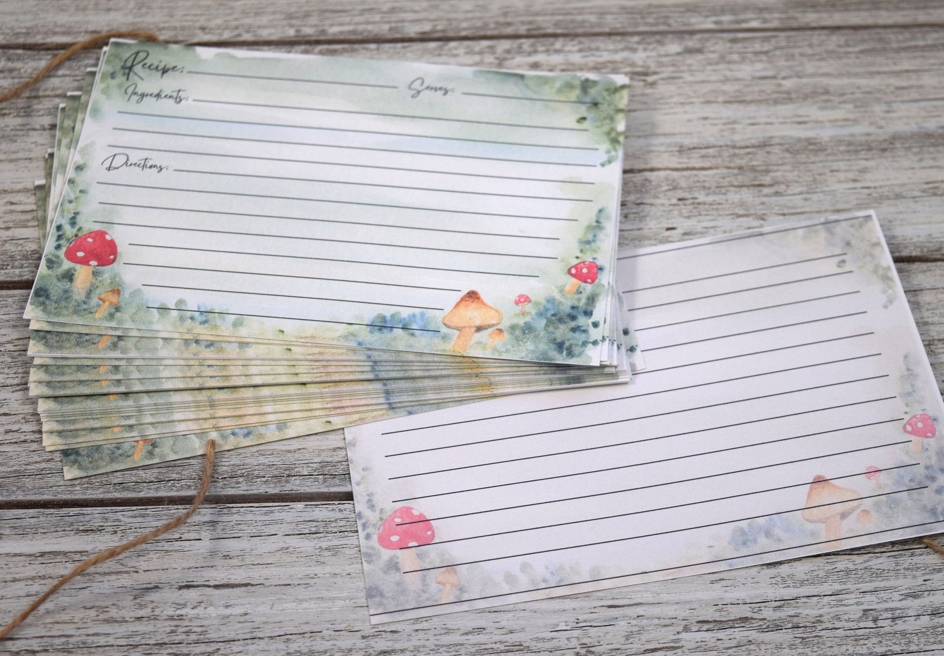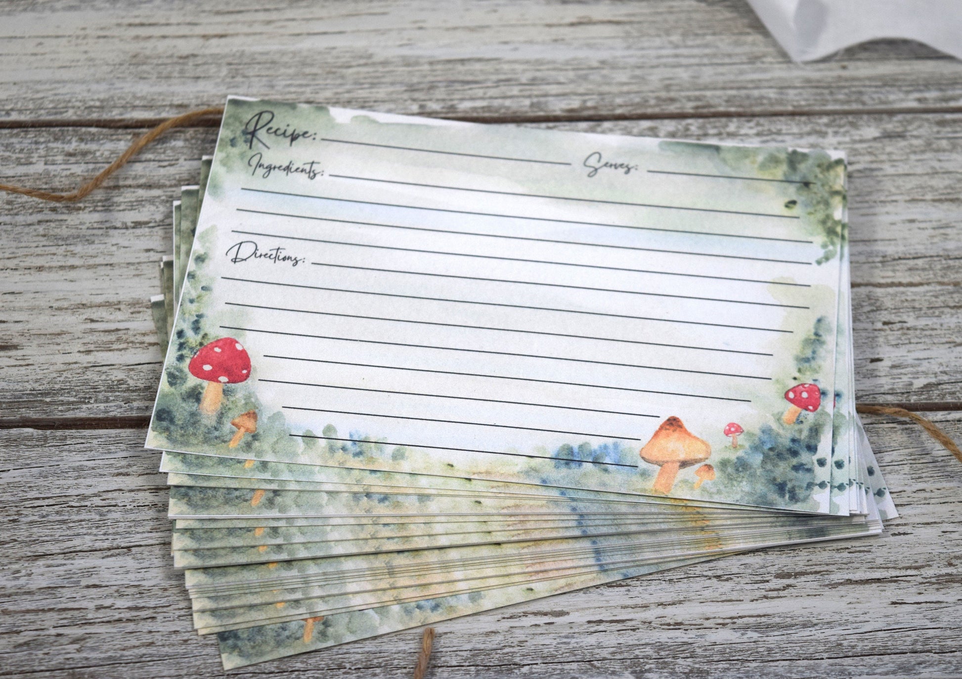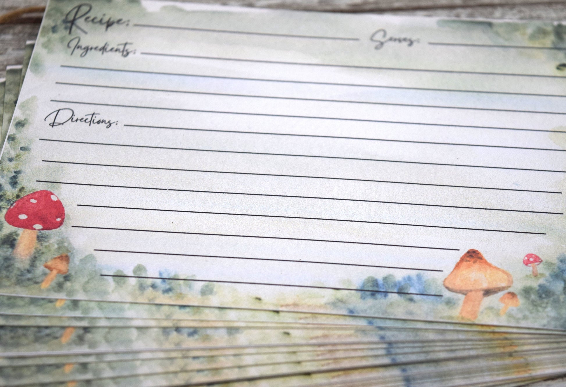 Calling all nature lovers! These quaint recipe cards feature a few charming little toadstools, with a shaded green background reminiscent of the woods. Each card is double sided, with a matching design on the back. It is a long process from designing and painting the artwork, to scanning and designing digitally, printing, and trimming the paper by hand.